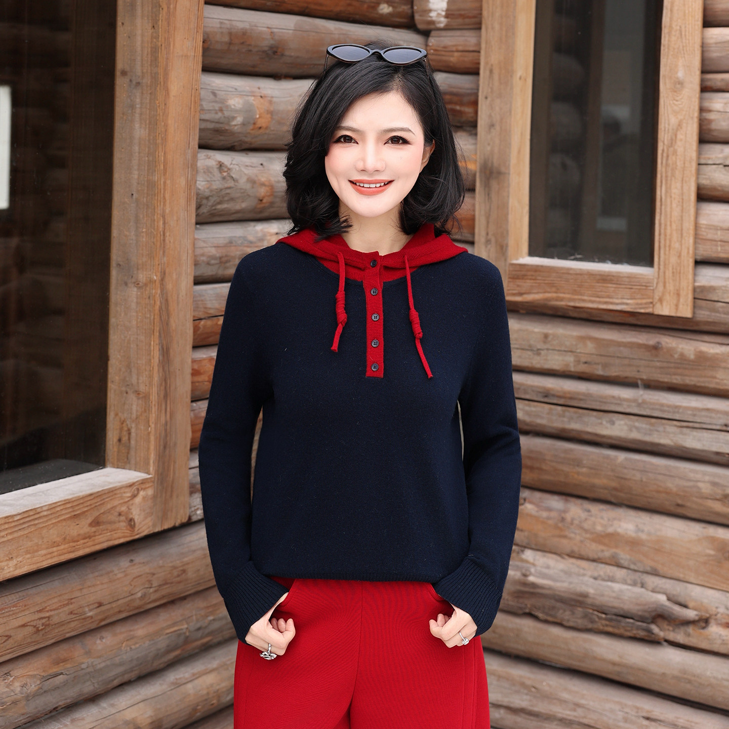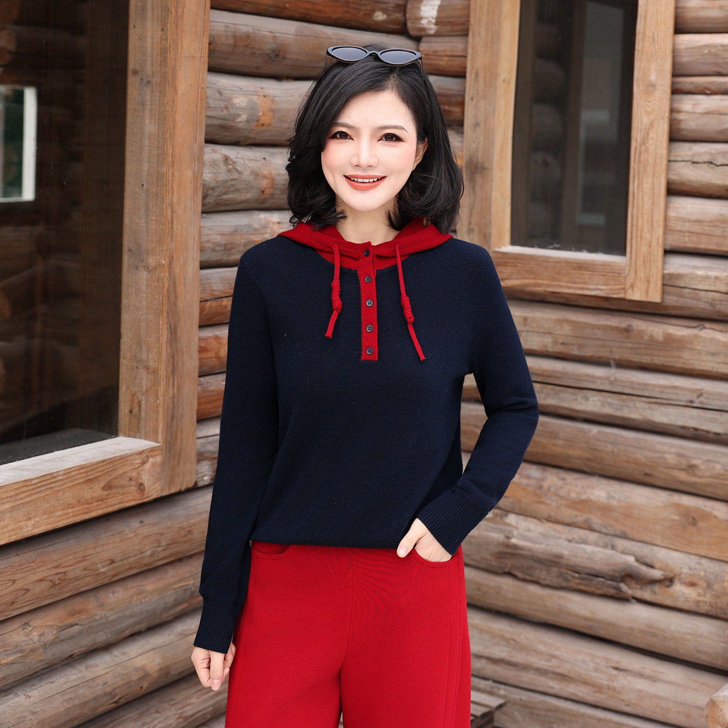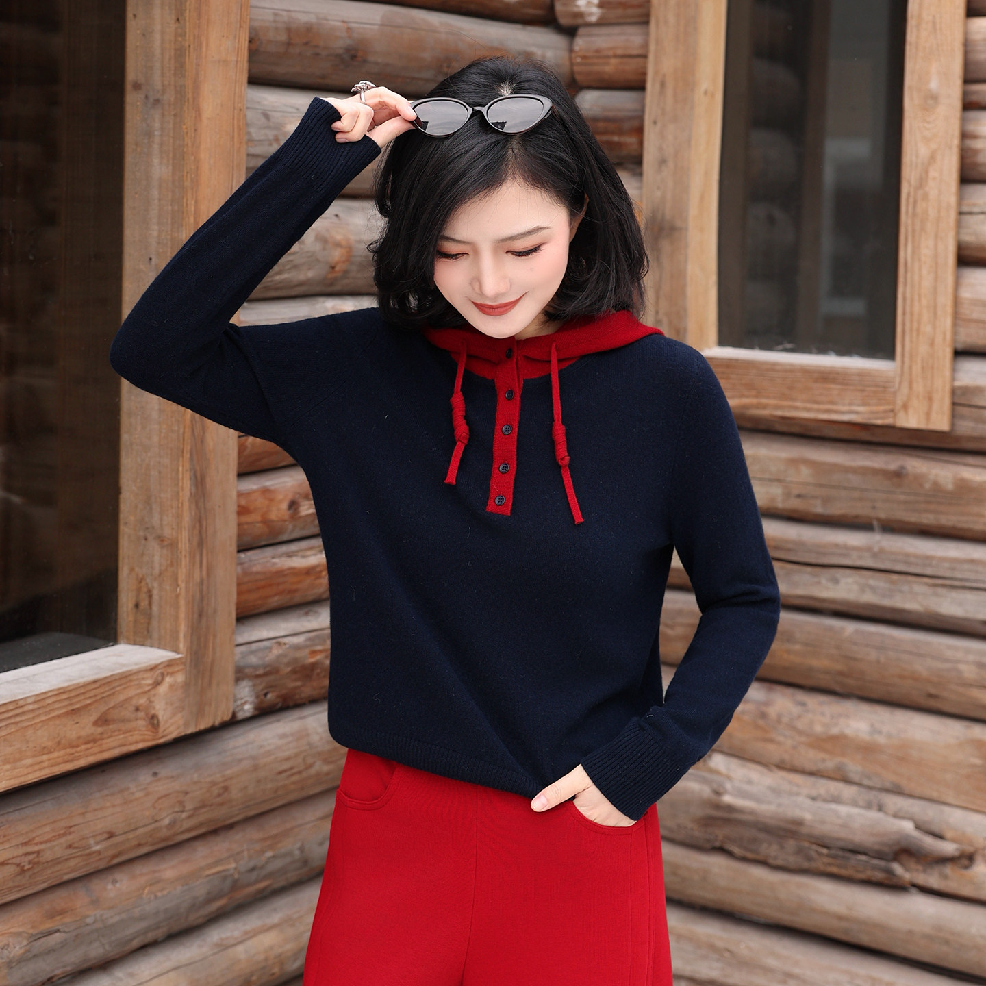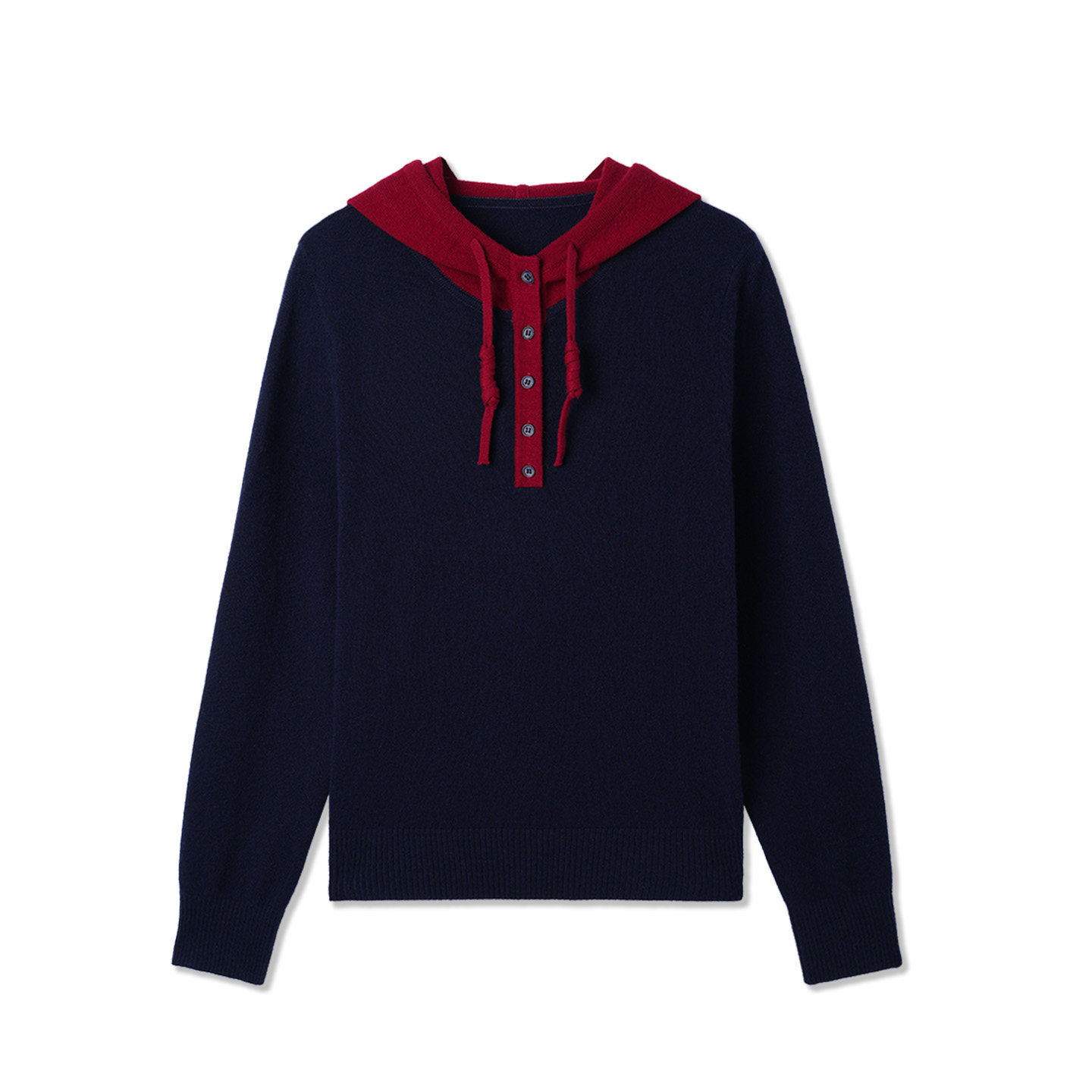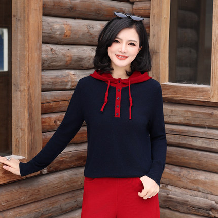 休闲撞色连帽抽绳全羊毛针织衫