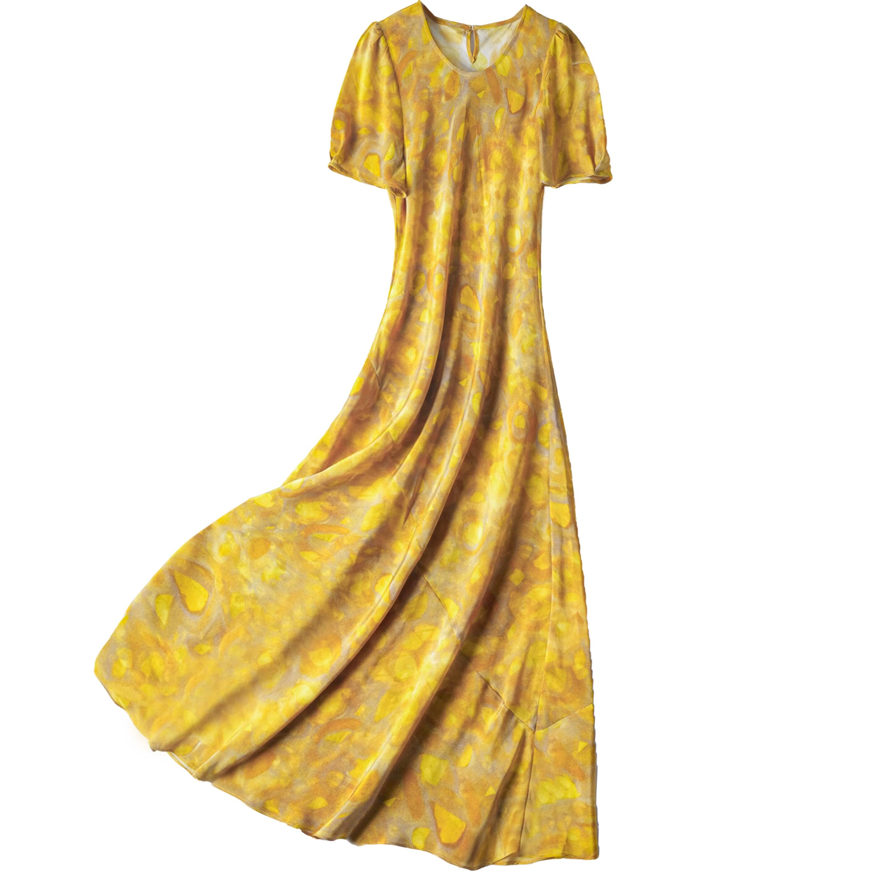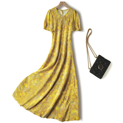 落日余晖!桑蚕丝晕染印花短袖法式真丝连衣裙时尚修身长裙显瘦女