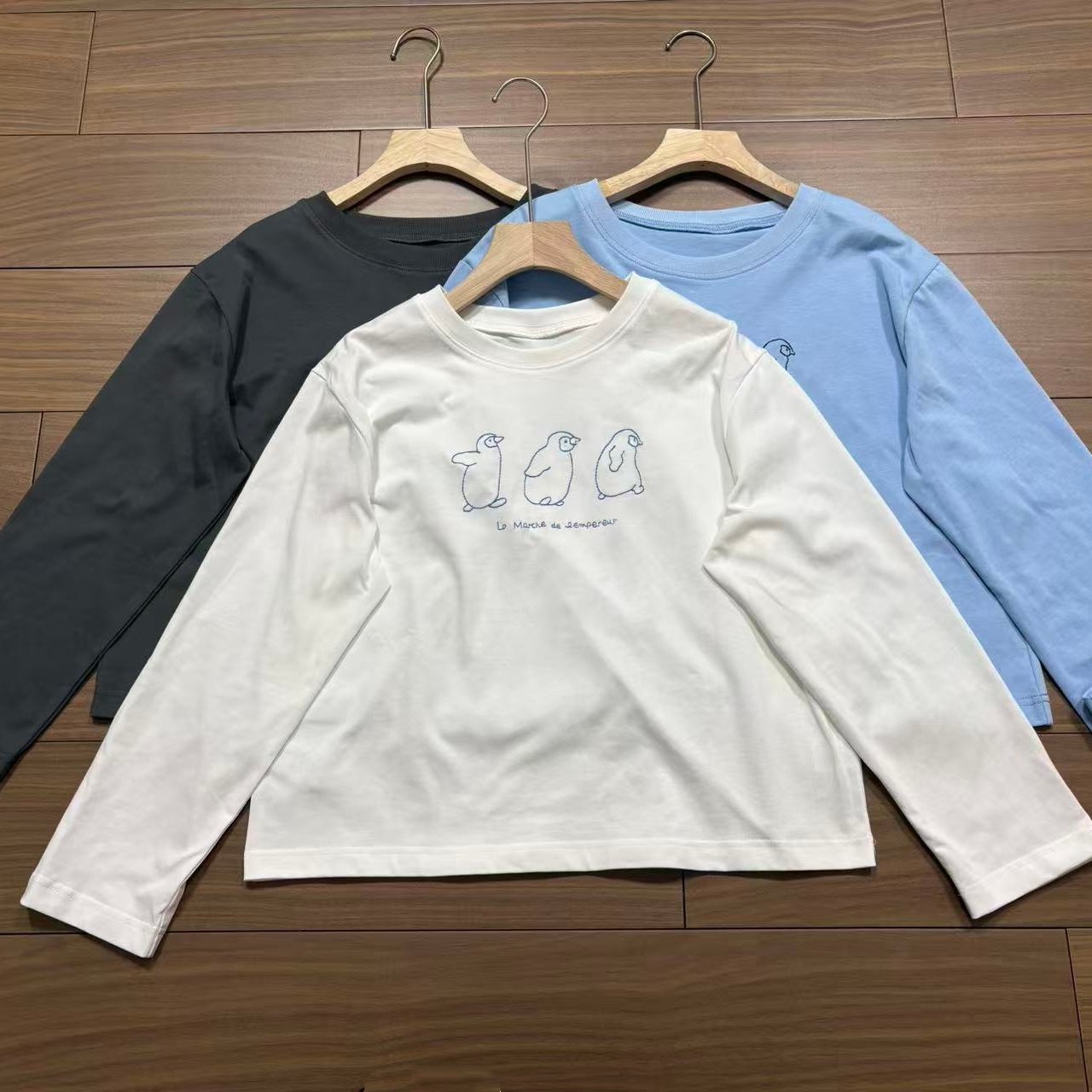 官网企鹅刺绣高支棉长袖T恤女2026春季新款甜美圆领纯棉宽松体恤