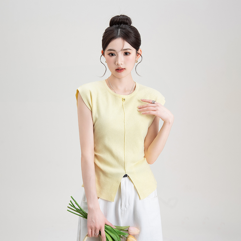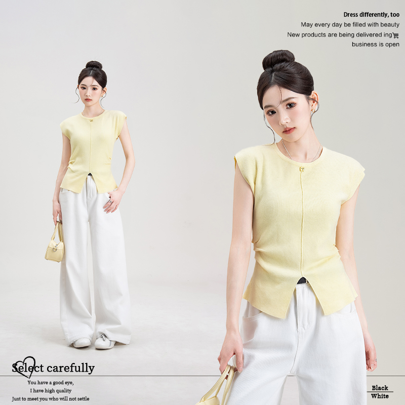 妮茨维黄色薄款短袖针织衫女秋季新款褶皱收腰开叉设计感修身上衣