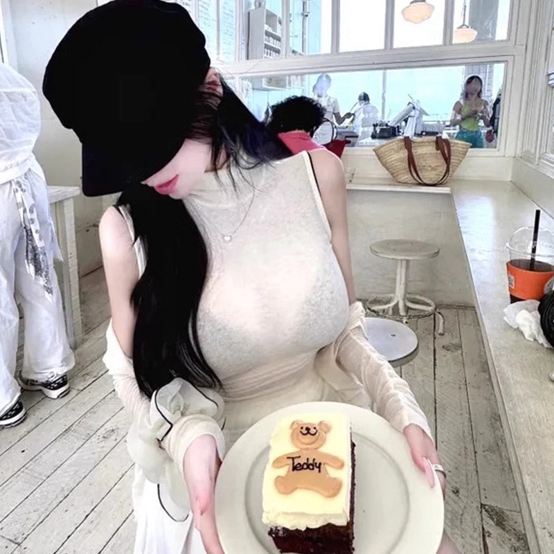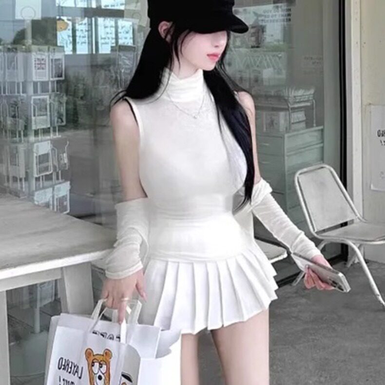 纯欲风灰色无袖高领紧身背心百褶裙韩系高级感两件套洋气网红气质