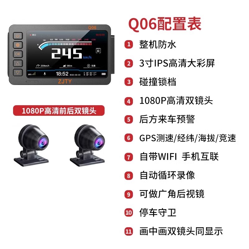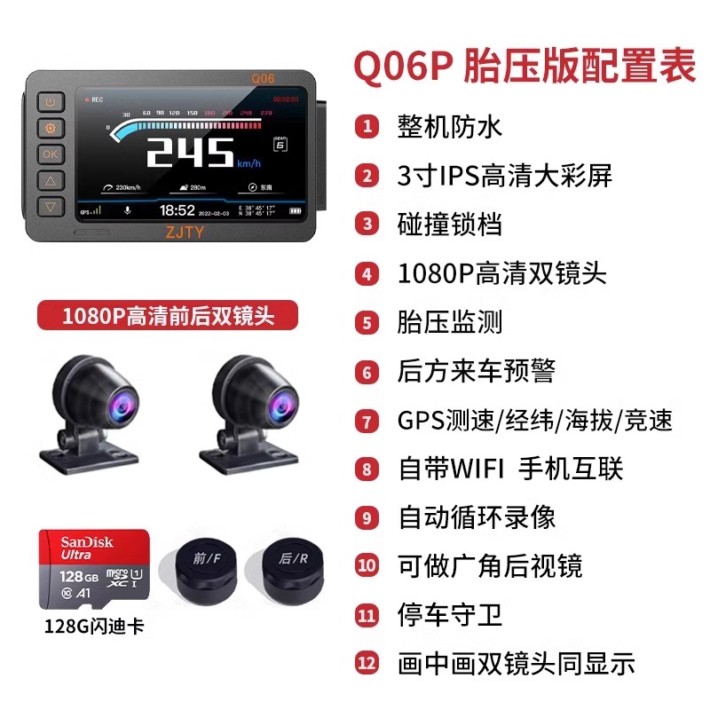 ZJTY摩托车行车记录仪胎压一体机机车高清双摄镜头防水来车预警