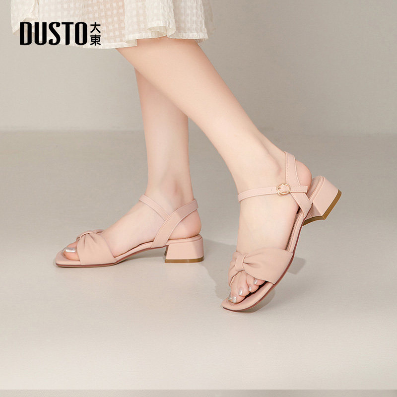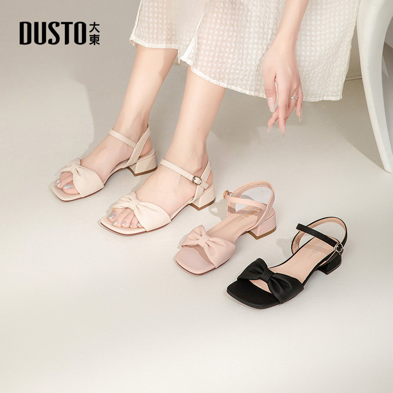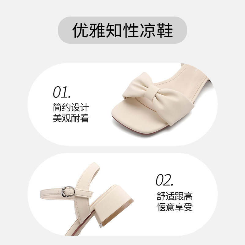 大东一字带凉鞋女鞋2025夏季带跟凉鞋蝴蝶结搭扣舒适粗跟鞋子0015