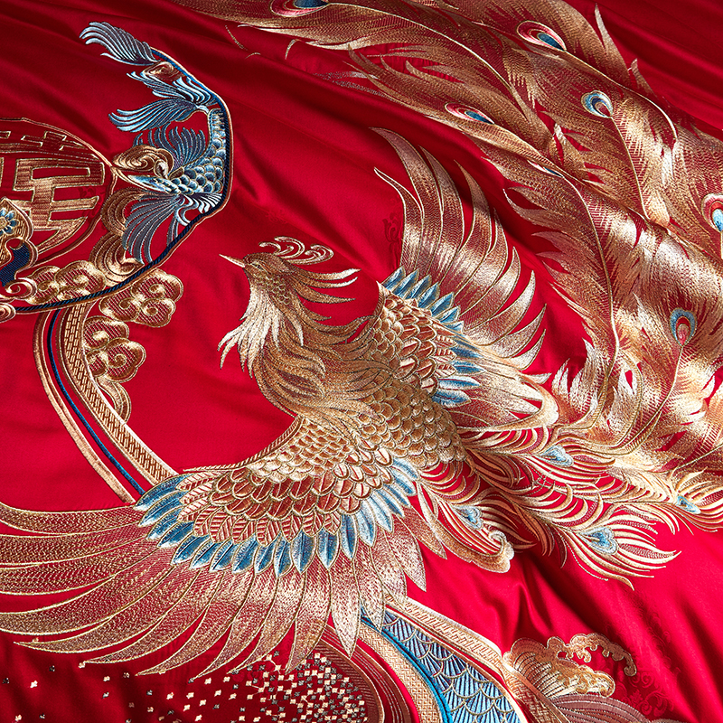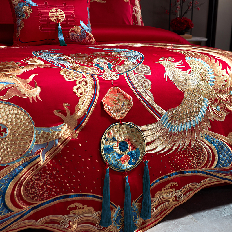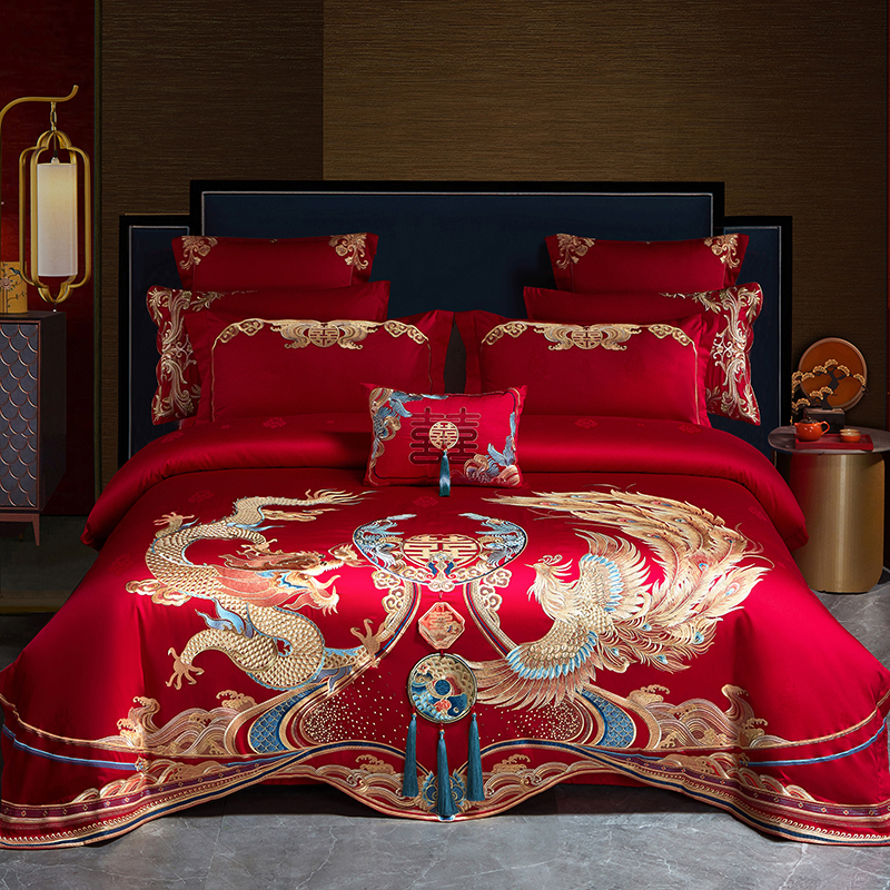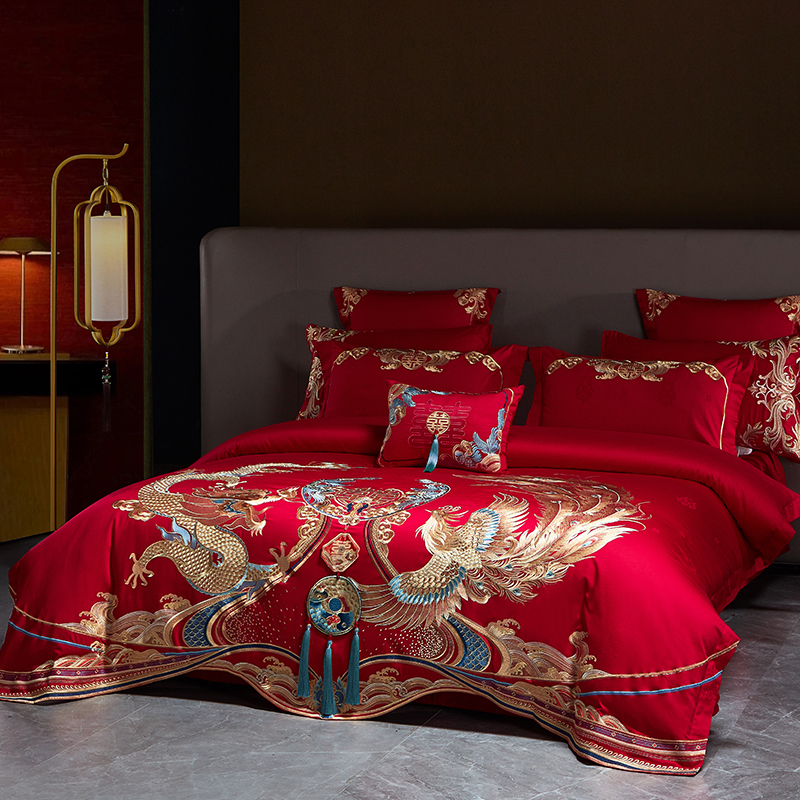140S贡缎龙凤婚庆四件套纯棉全棉被套红色结婚陪嫁六件套床上用品