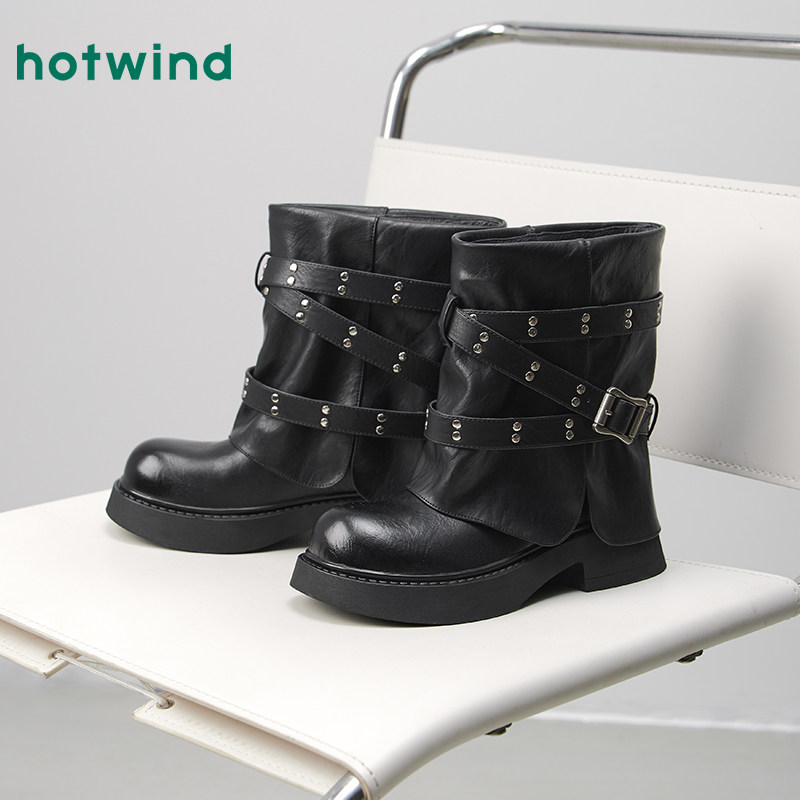 热风西部骑士靴女2025年冬季新款短筒裤管靴百搭黑色时装靴子女鞋