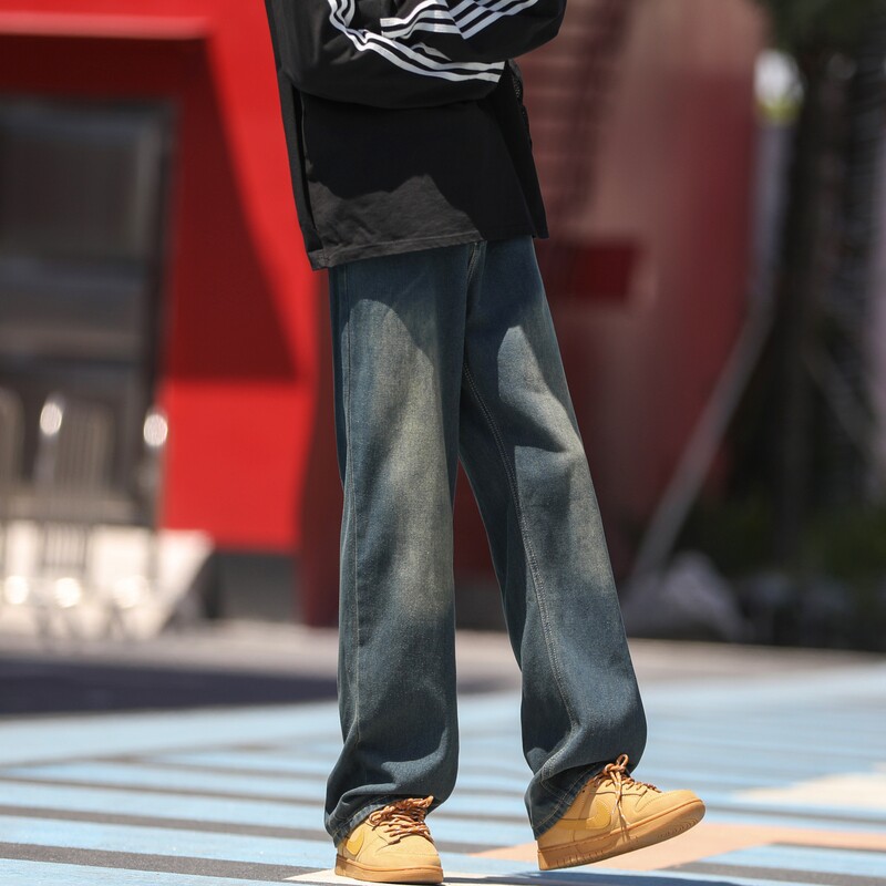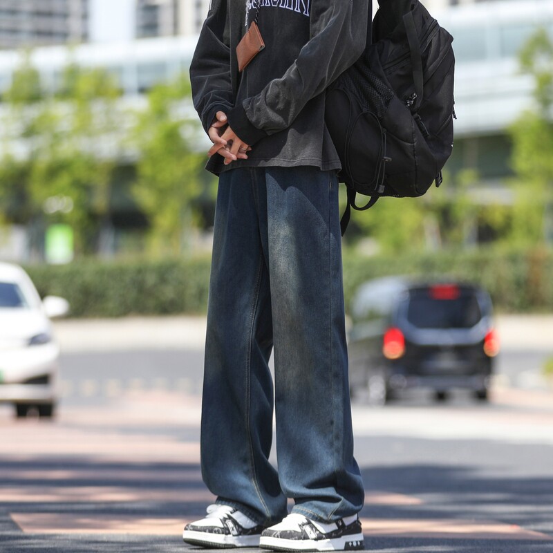 CeTky美式黑灰水洗牛仔裤男春秋季高街宽松直筒后腰松紧腰休闲裤