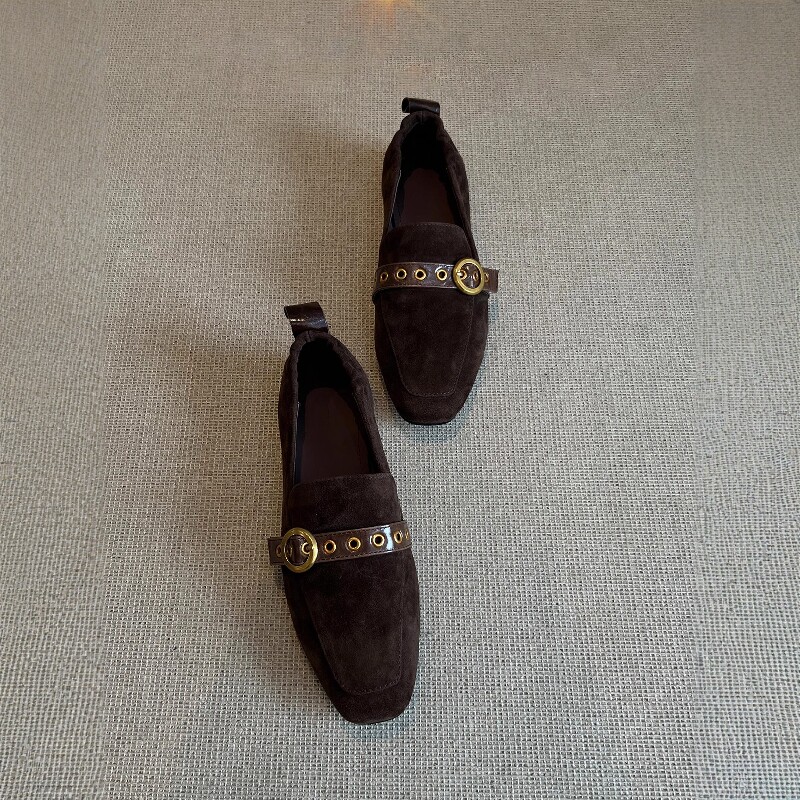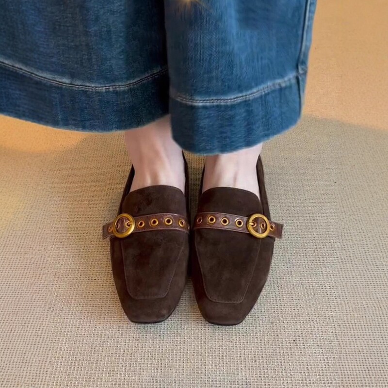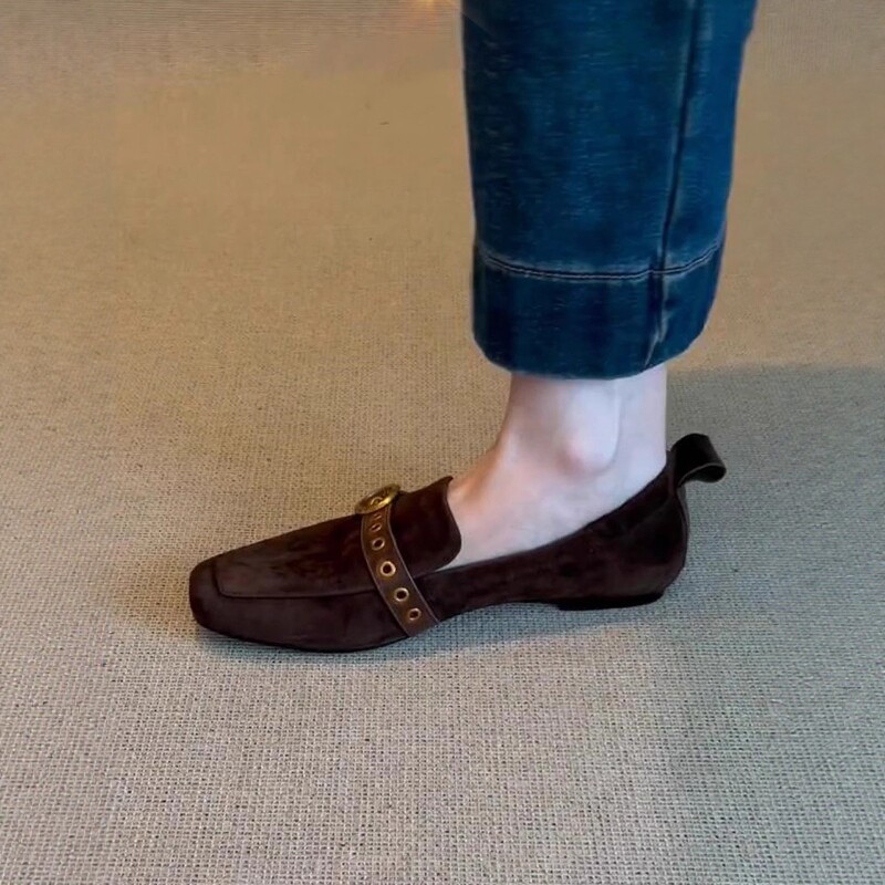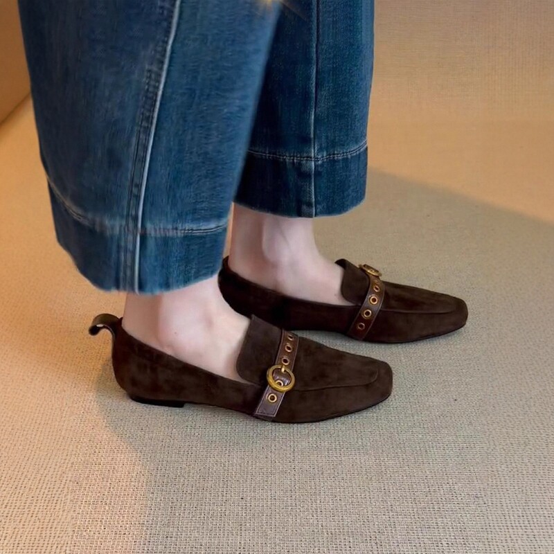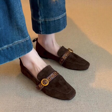 复古风方头乐福鞋女春秋新款皮带扣百搭通勤豆豆鞋一脚蹬平底单鞋