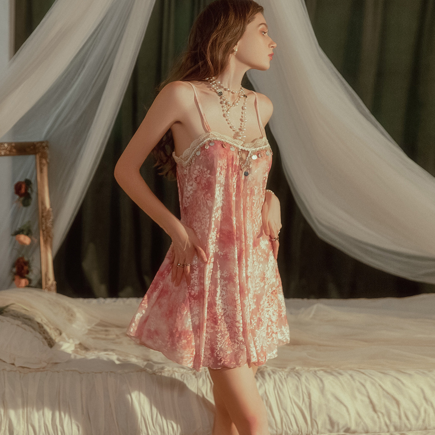 今夕何夕性感睡衣女纯欲风V领蕾丝边印花宽松吊带秋季睡裙家居服