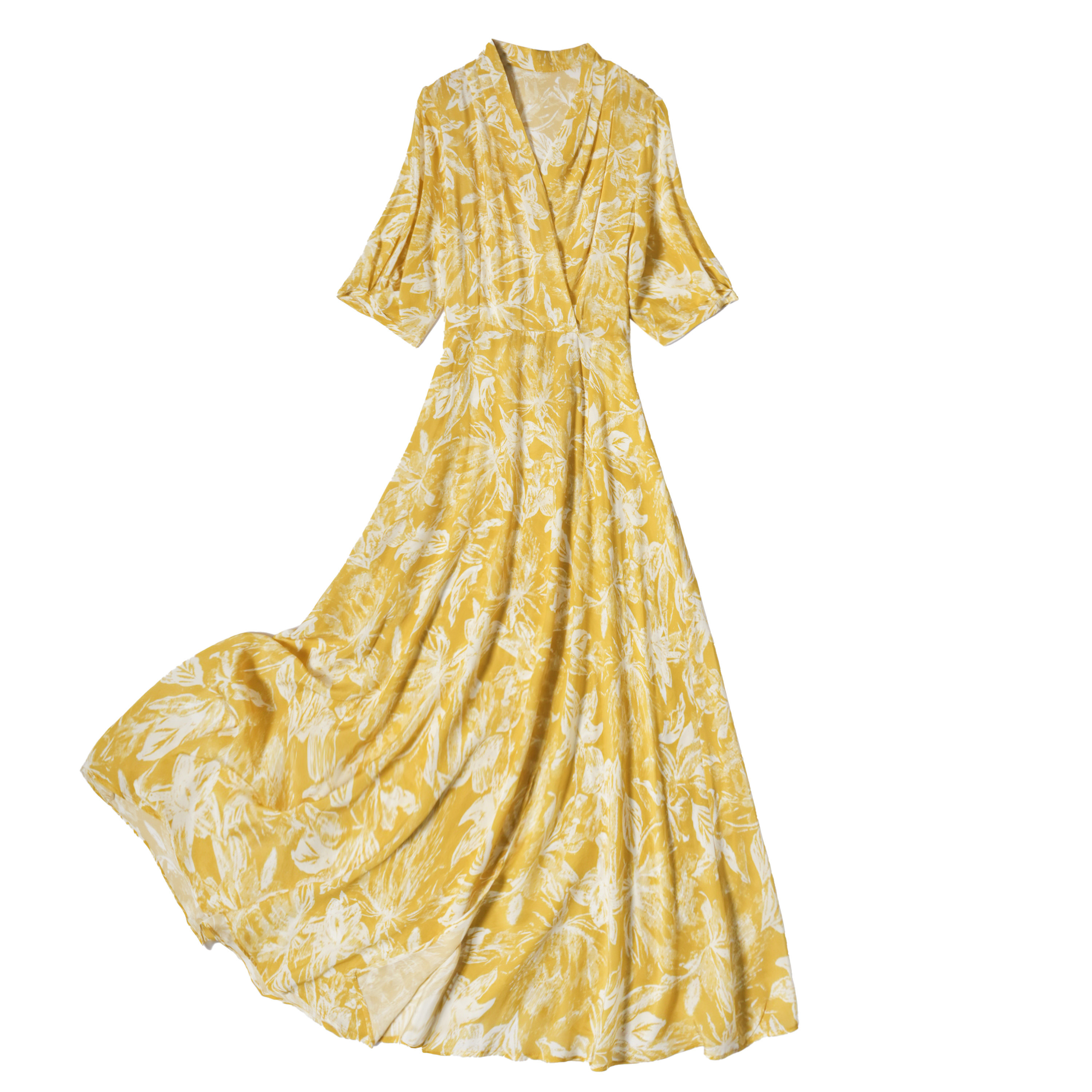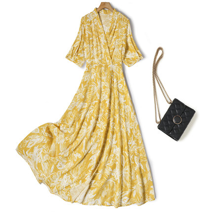 一抹明媚黄!巨飘逸大摆裙桑蚕丝真丝通勤气质连衣裙显瘦长裙女夏