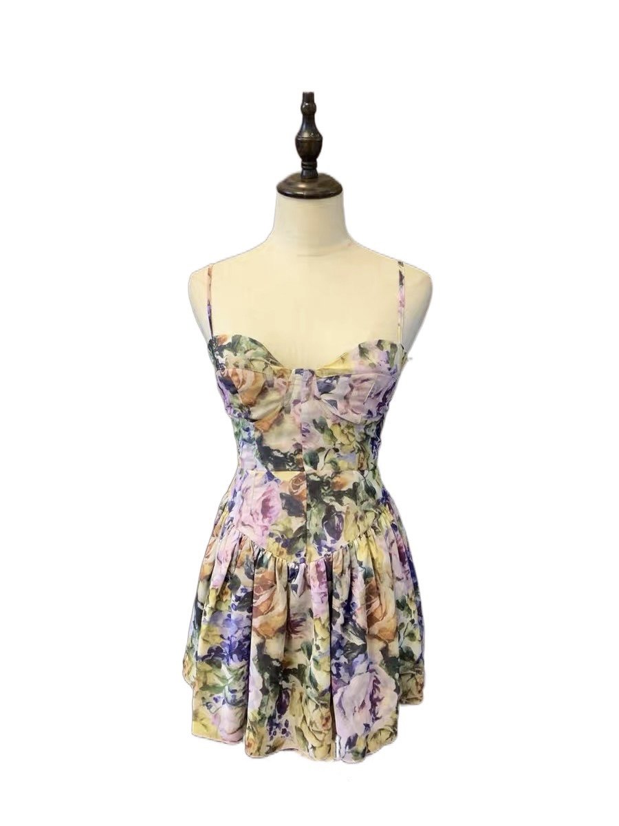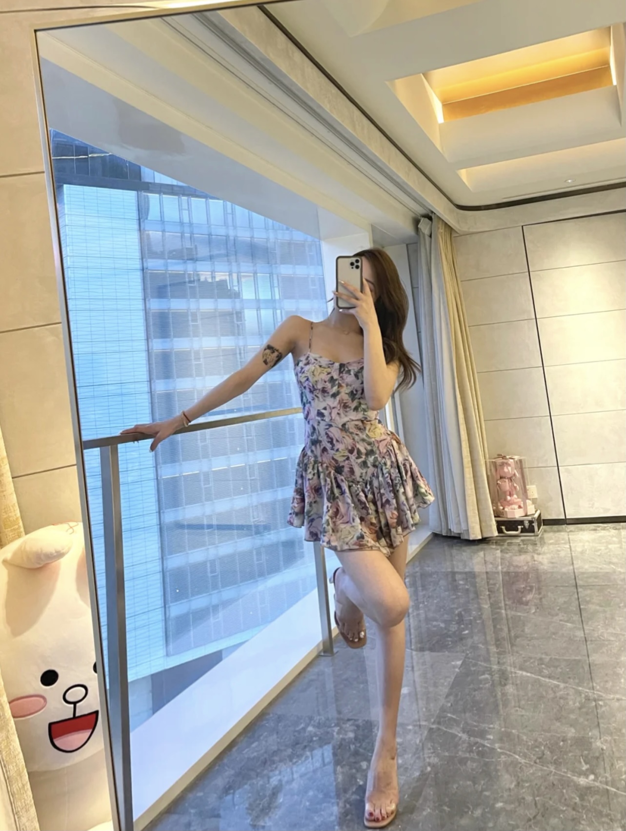 jennie同款鱼骨剪裁碎花雪纺吊带连衣裙收腰性感荷叶边鱼尾裙短裙