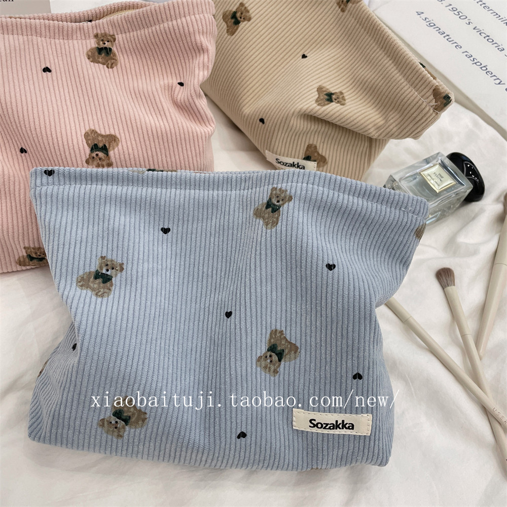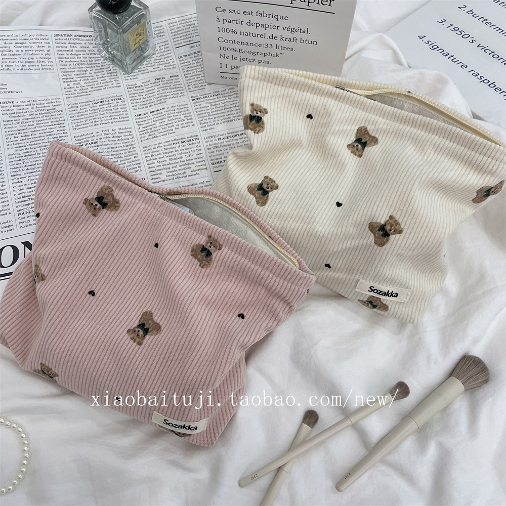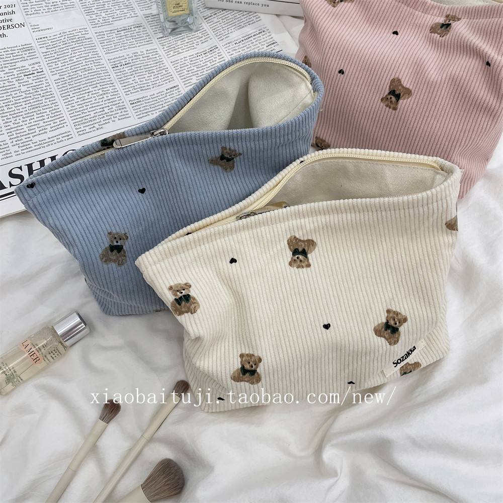 小白兔几 秋冬新款可爱小熊灯芯绒化妆包便携手拿包外出收纳袋