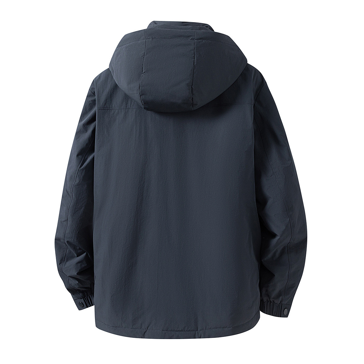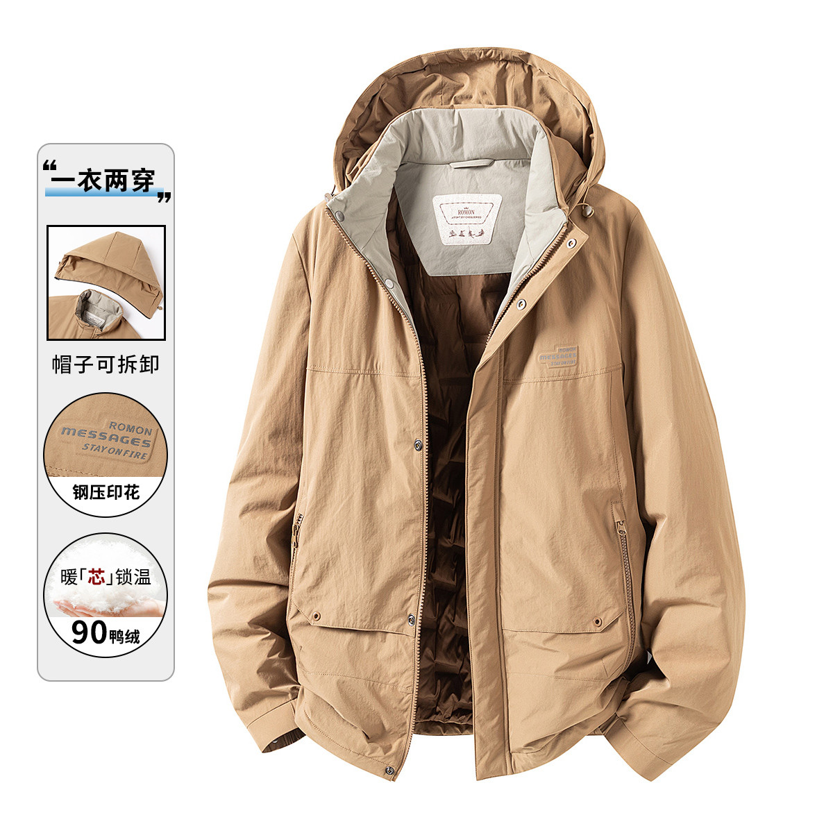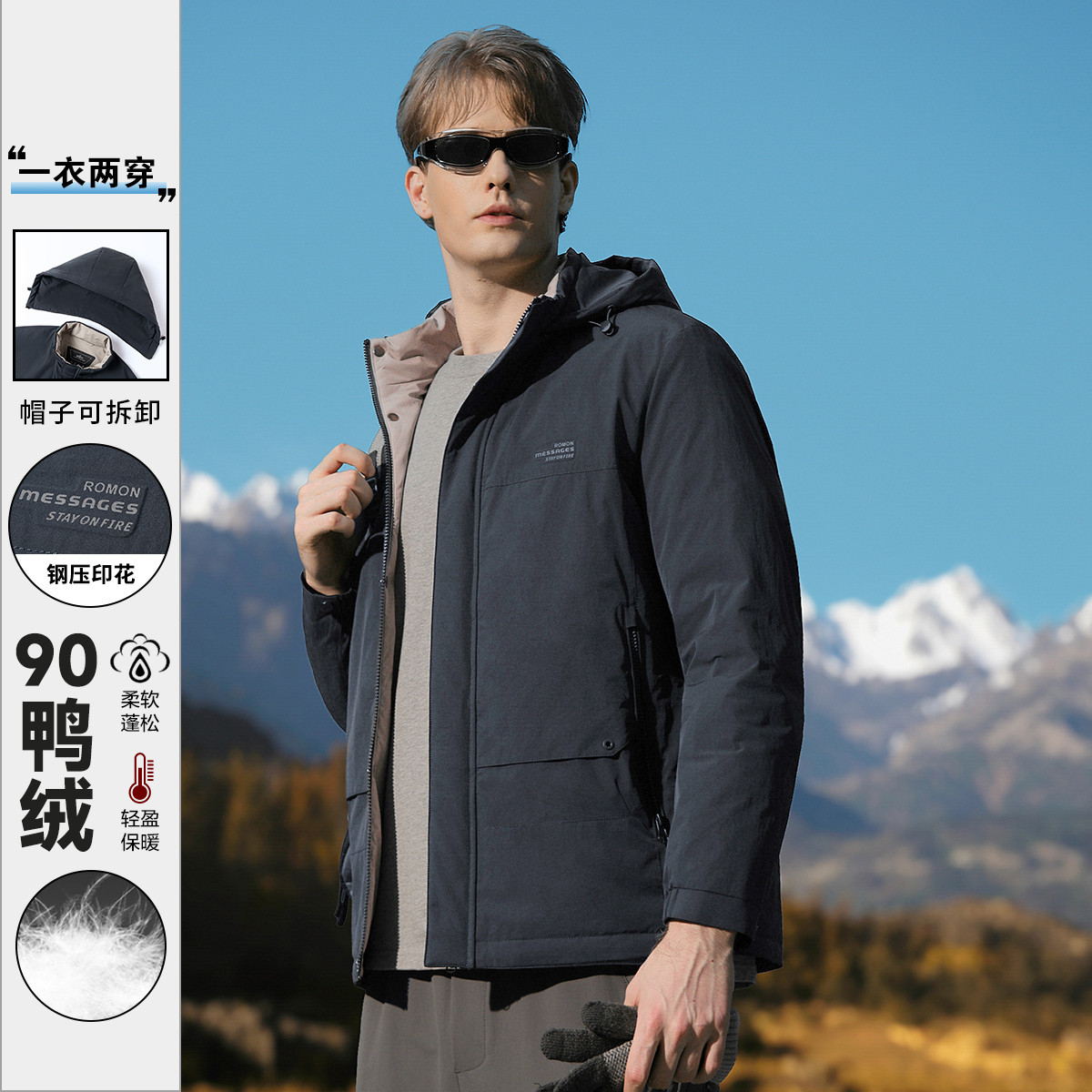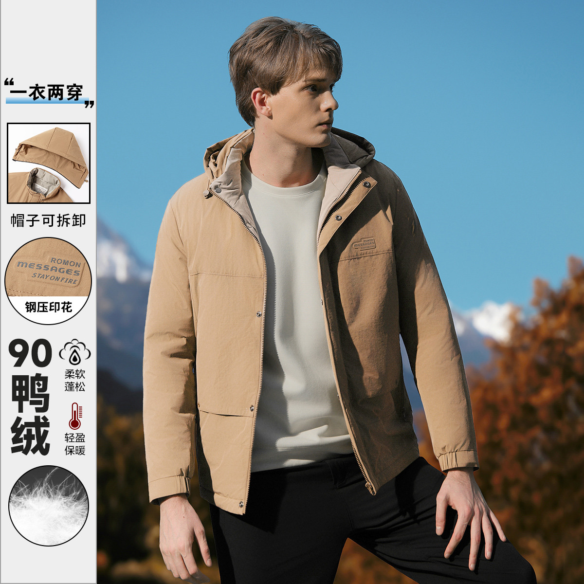 罗蒙90鸭绒冬男士可拆可脱卸连帽立领轻薄羽绒服拉链口袋印花外套