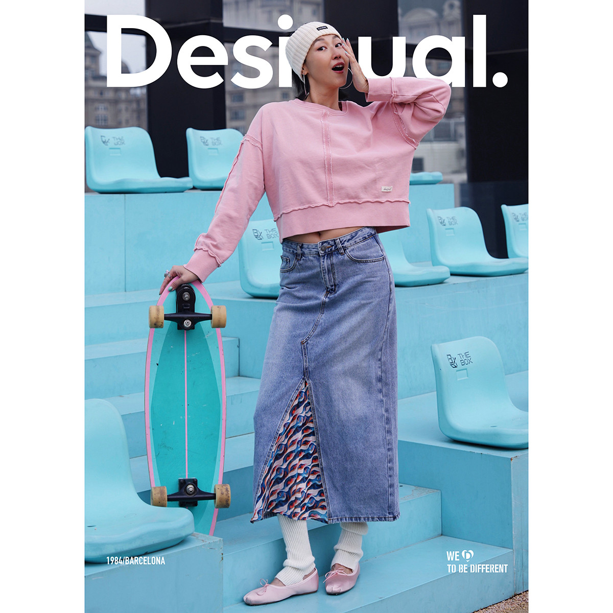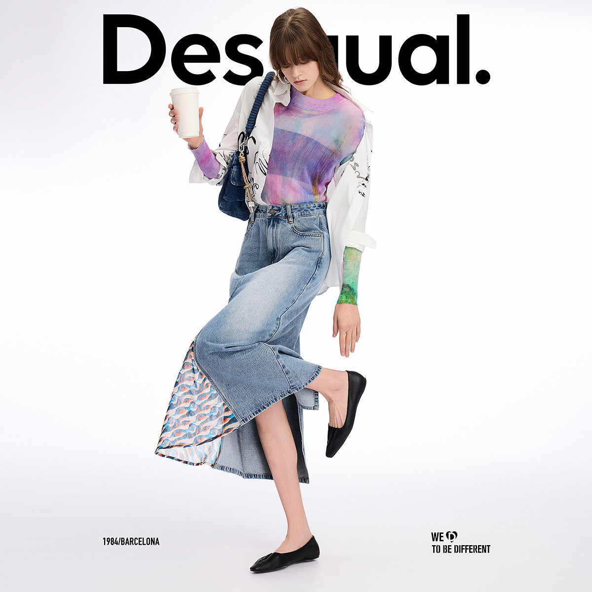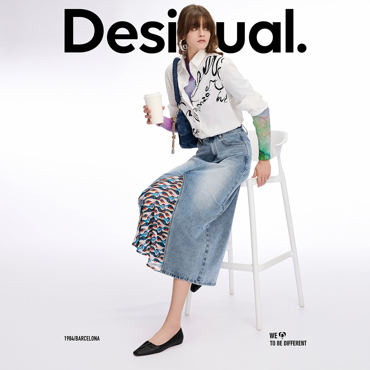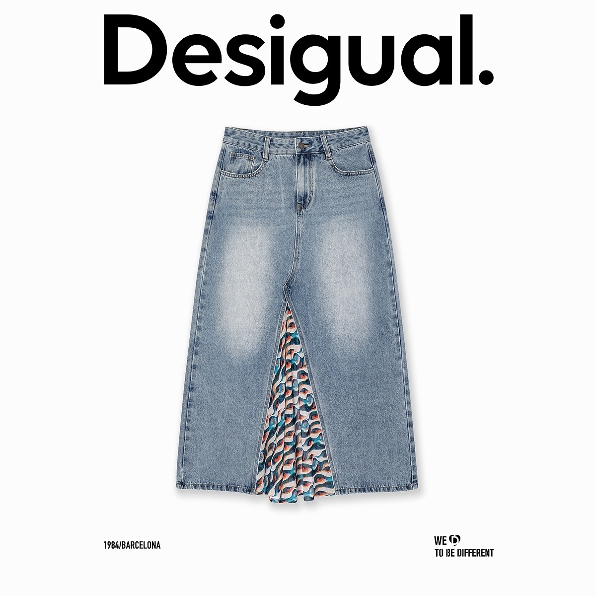 Desigual牛仔拼接印花雪纺直筒版型中长款半身裙