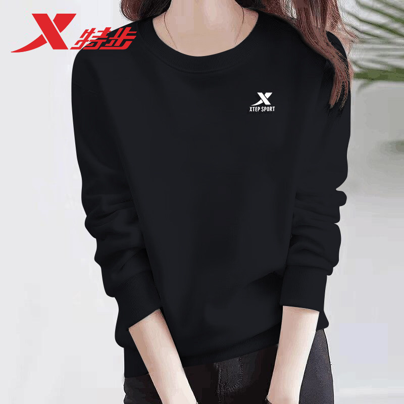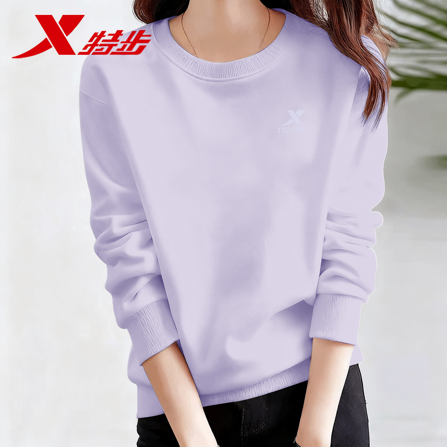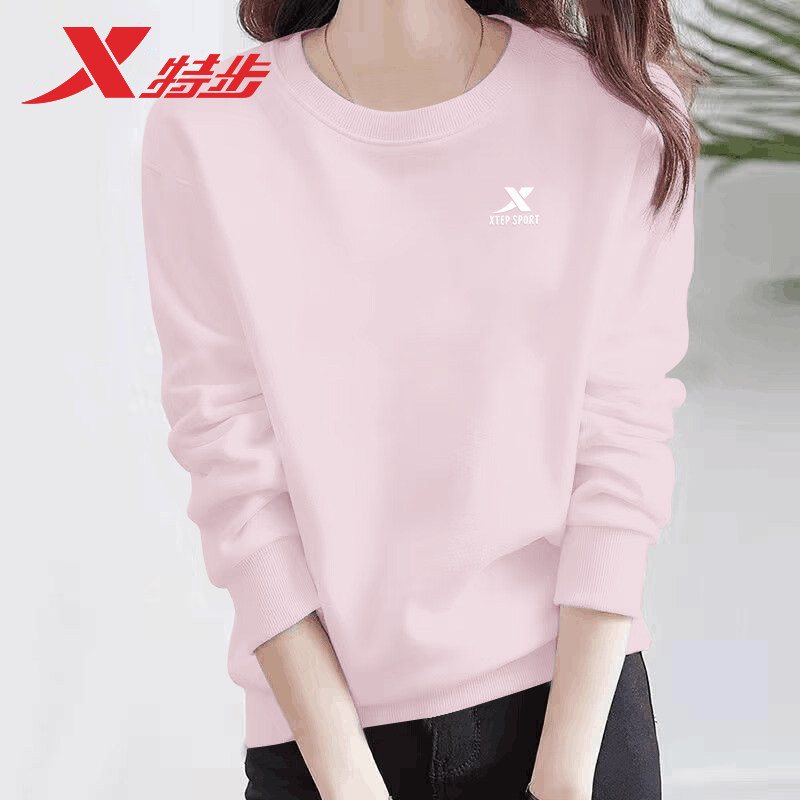 特步冬季加绒卫衣女运动上衣2025新款圆领套头衫白色休闲长袖T恤