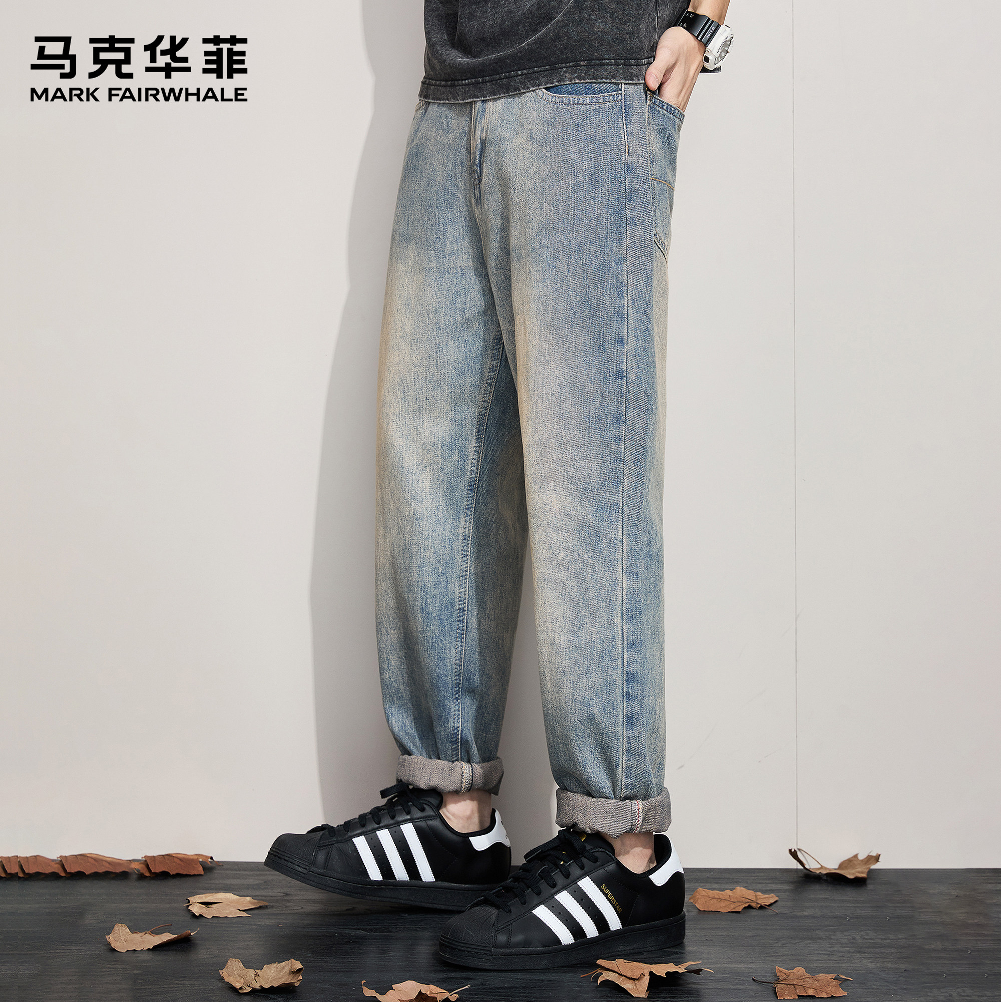 马克华菲牛仔裤男新款潮牌美式复古水洗磨白青少年痞帅垂感阔腿裤