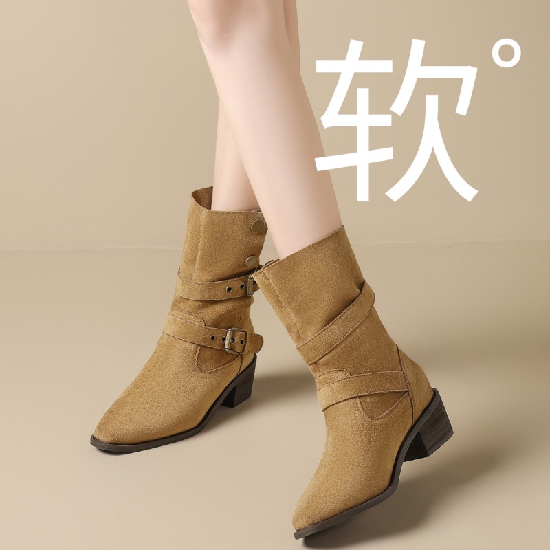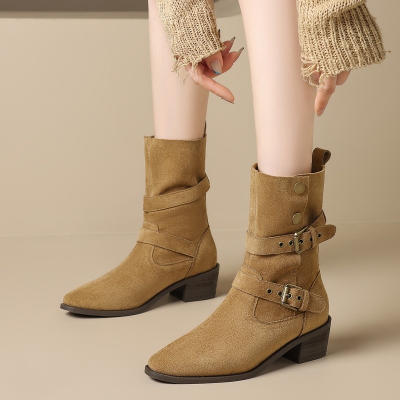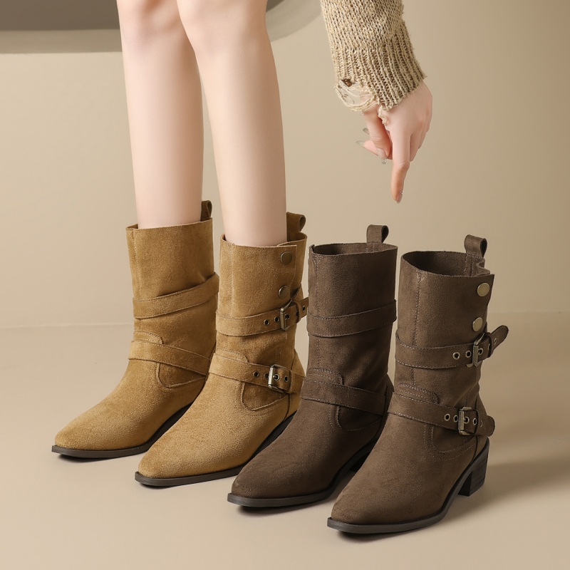 棕色西部牛仔靴女2025年秋冬季新款爆款美拉德粗跟马丁靴两穿短靴