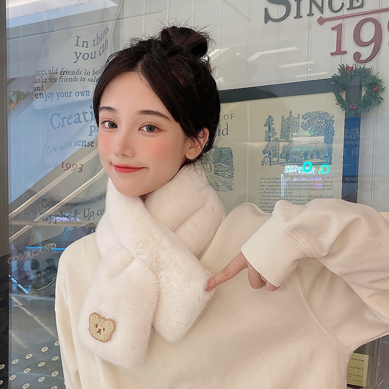 围脖冬季女ins可爱小熊学生韩版百搭仿兔毛交叉毛绒围巾保暖抗寒