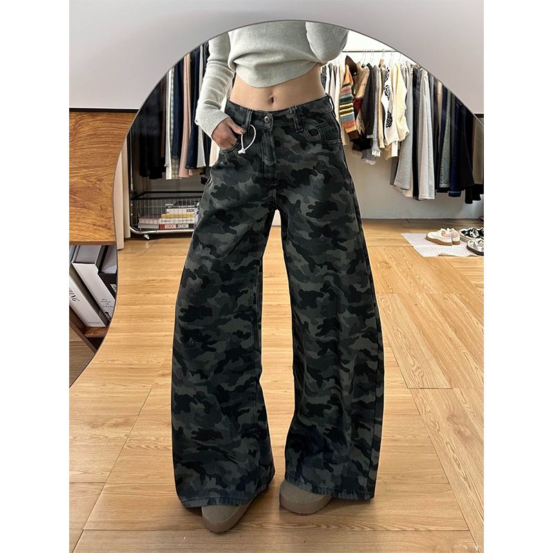 美式复古迷彩工装裤女高腰显瘦宽松口袋休闲直筒阔腿拖地牛仔长裤