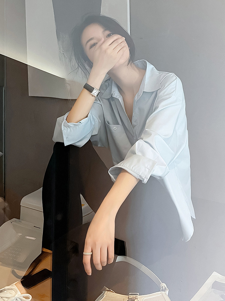 秋季抗皱蓝色衬衫女设计感小众宽松休闲港味气质职业长袖衬衣外套