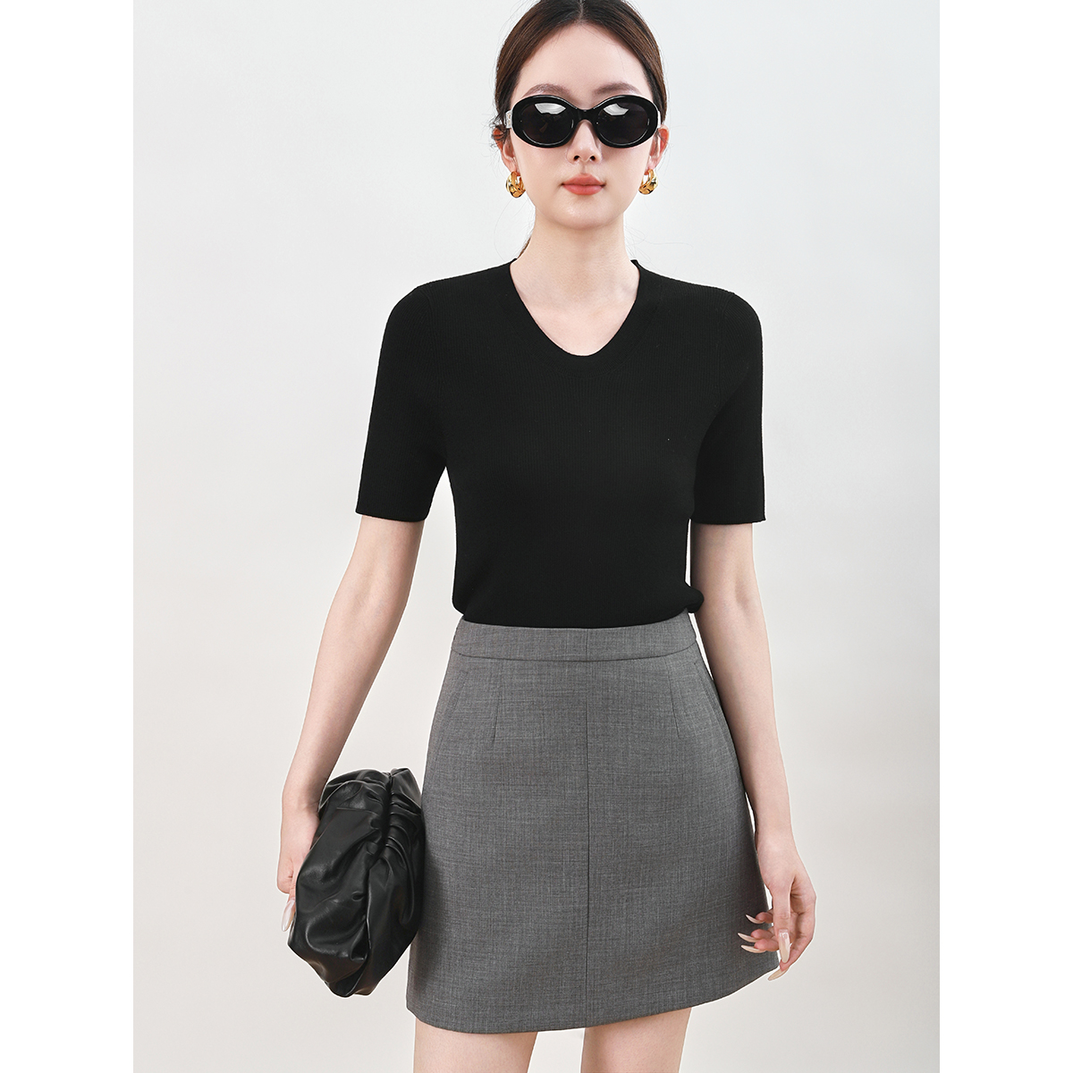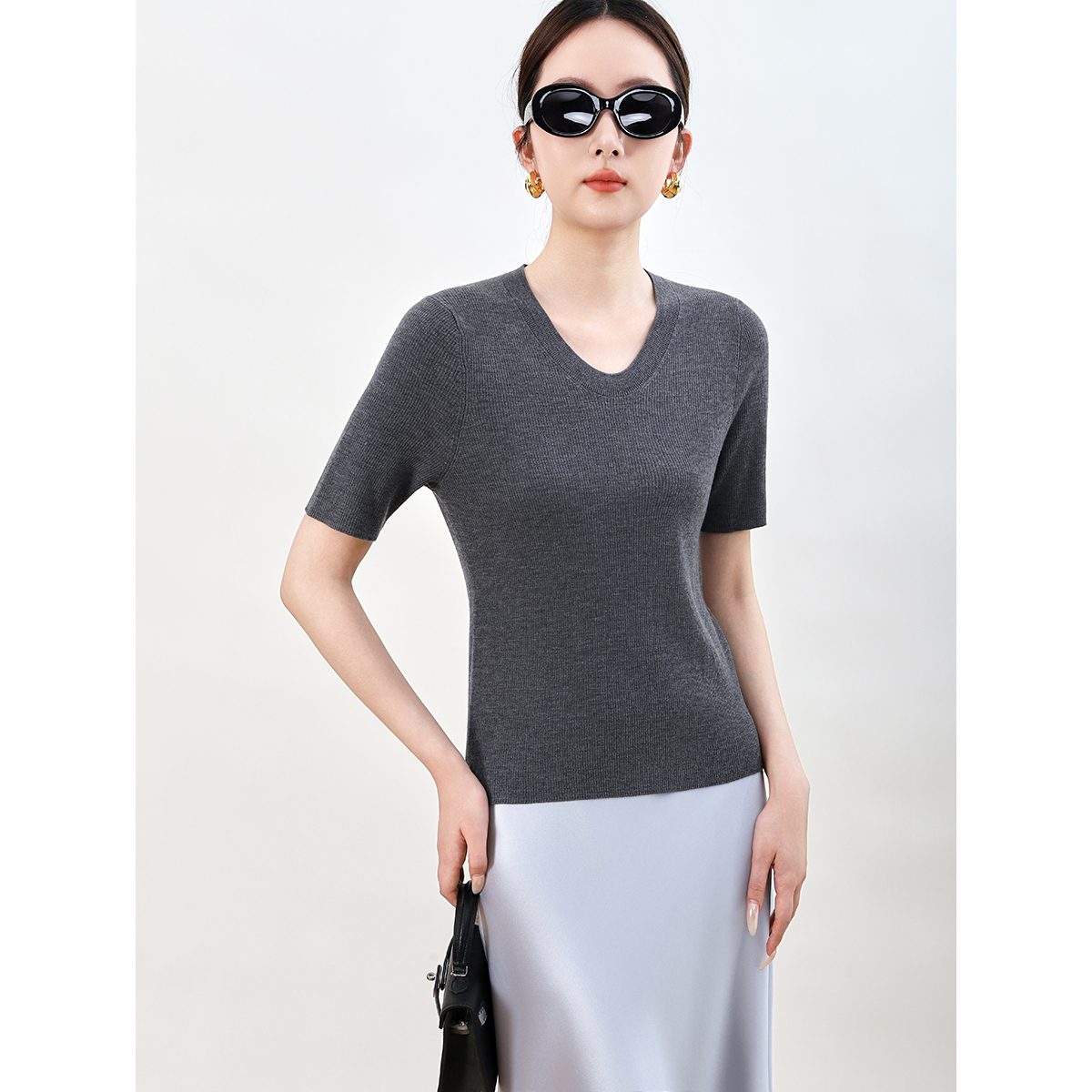 Mooelpom夏无缝一体全羊毛针织衫修身套头纯色T恤短袖女百搭显瘦