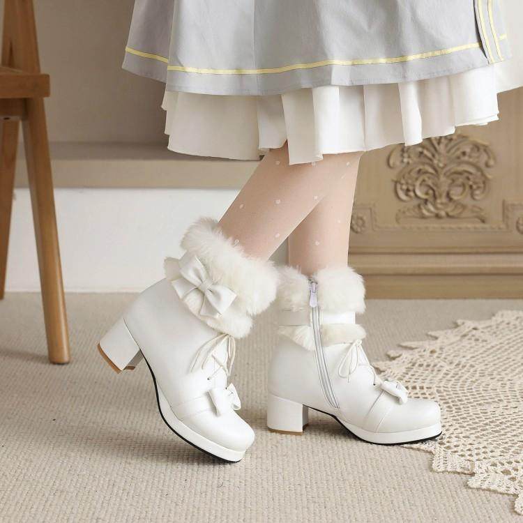 日系女靴蝴蝶结秋冬萝莉毛毛短靴洛丽塔lolita高跟JK制服花嫁白色