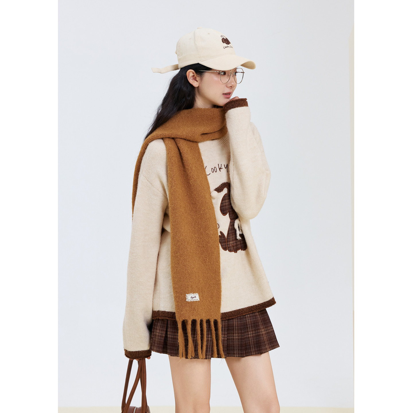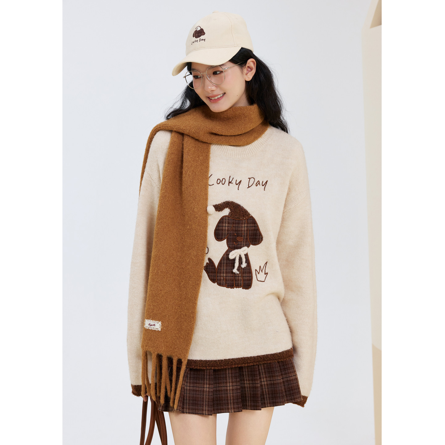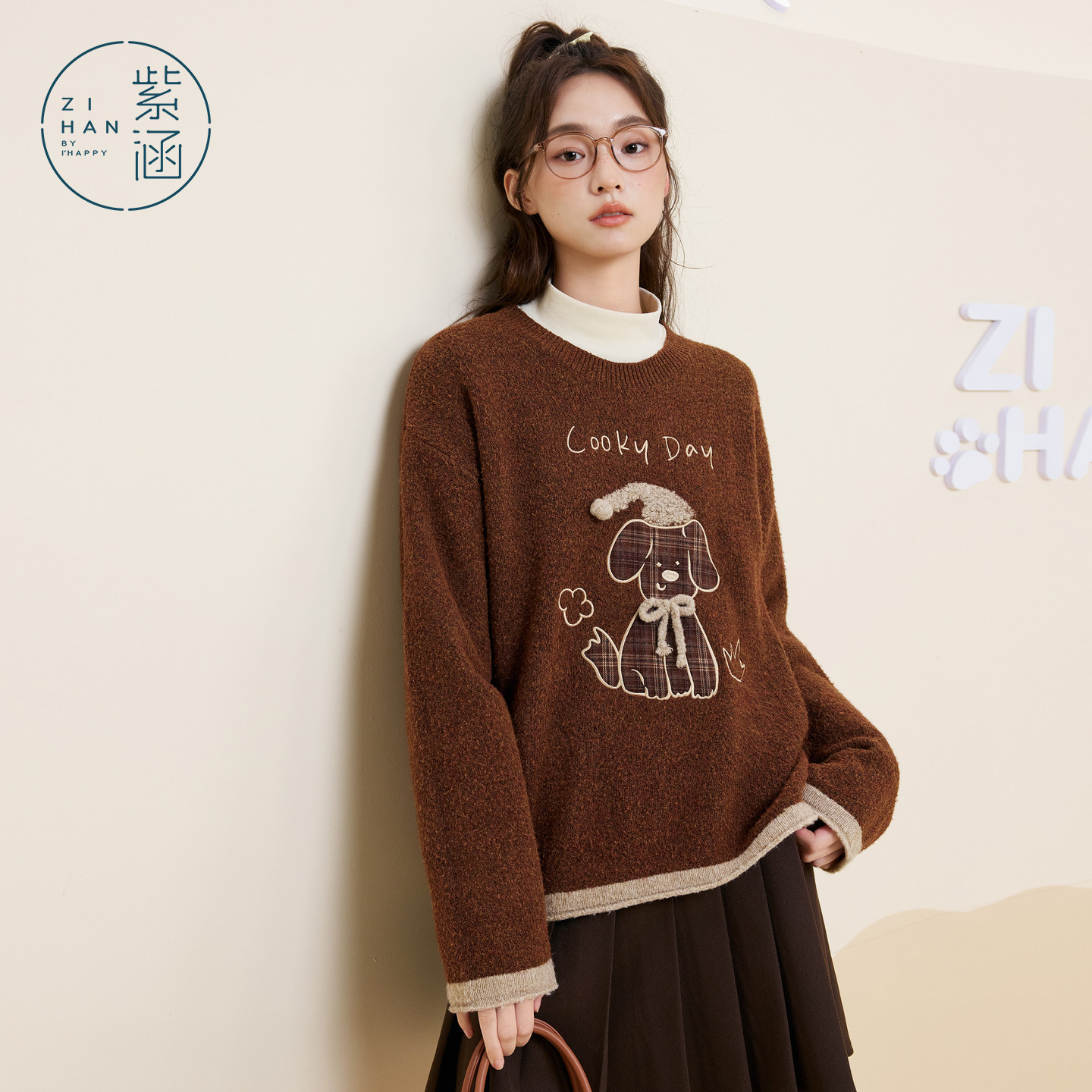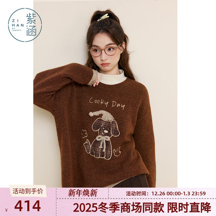 紫涵圆领套头毛衣女2025冬季新款可爱贴布小狗刺绣宽松内搭针织衫