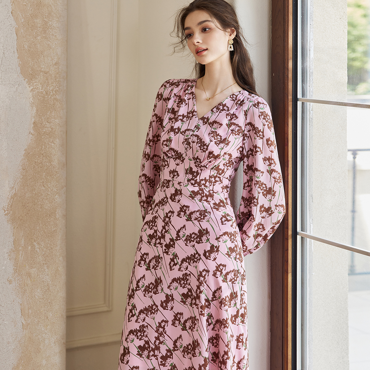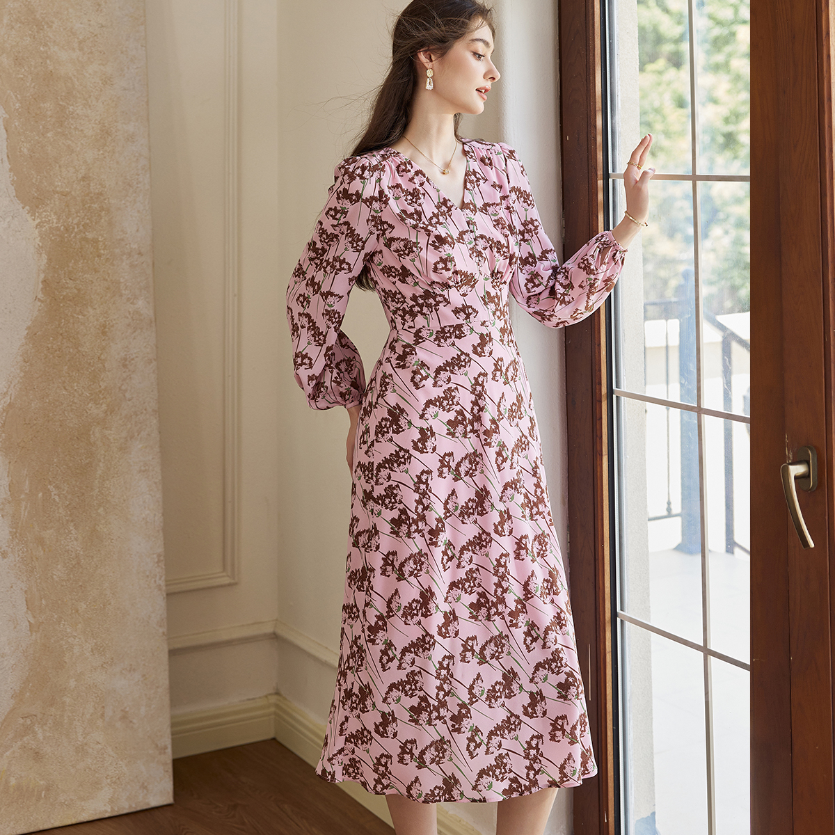 罗衣法式浪漫粉花色连衣裙2025秋季新款漂亮泡泡袖收腰裙子10938