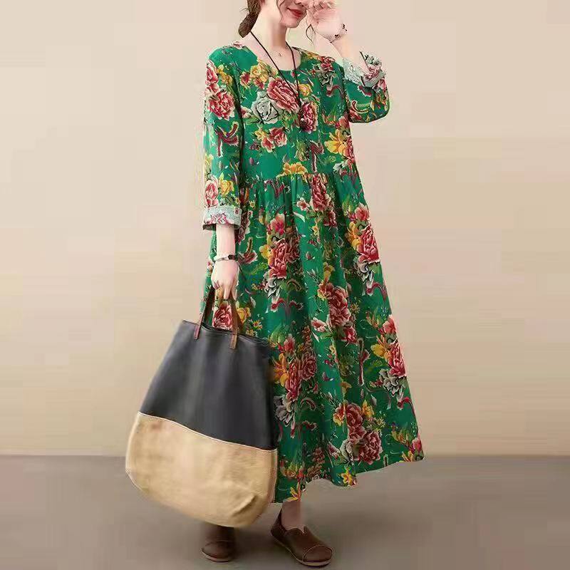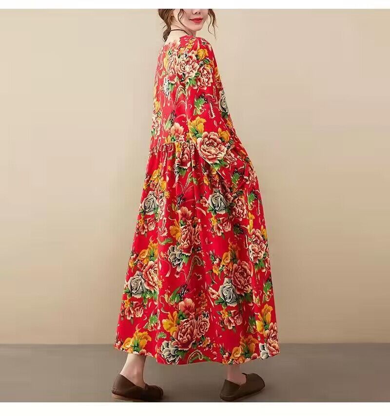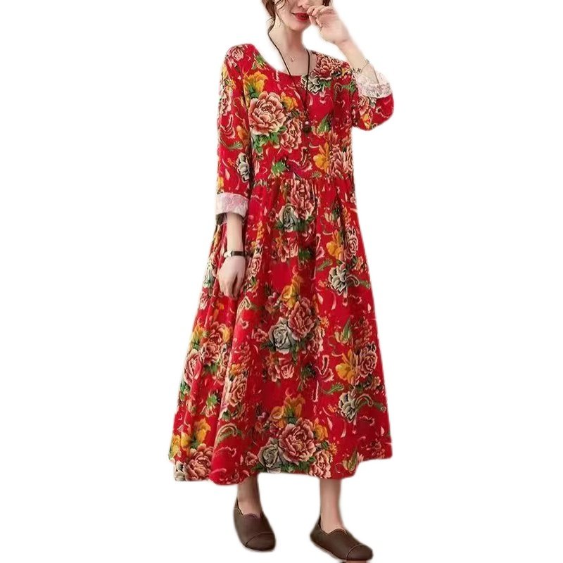 2026秋冬新款民族风特色大红长款碎花文艺大码胖MM宽松大摆连衣裙