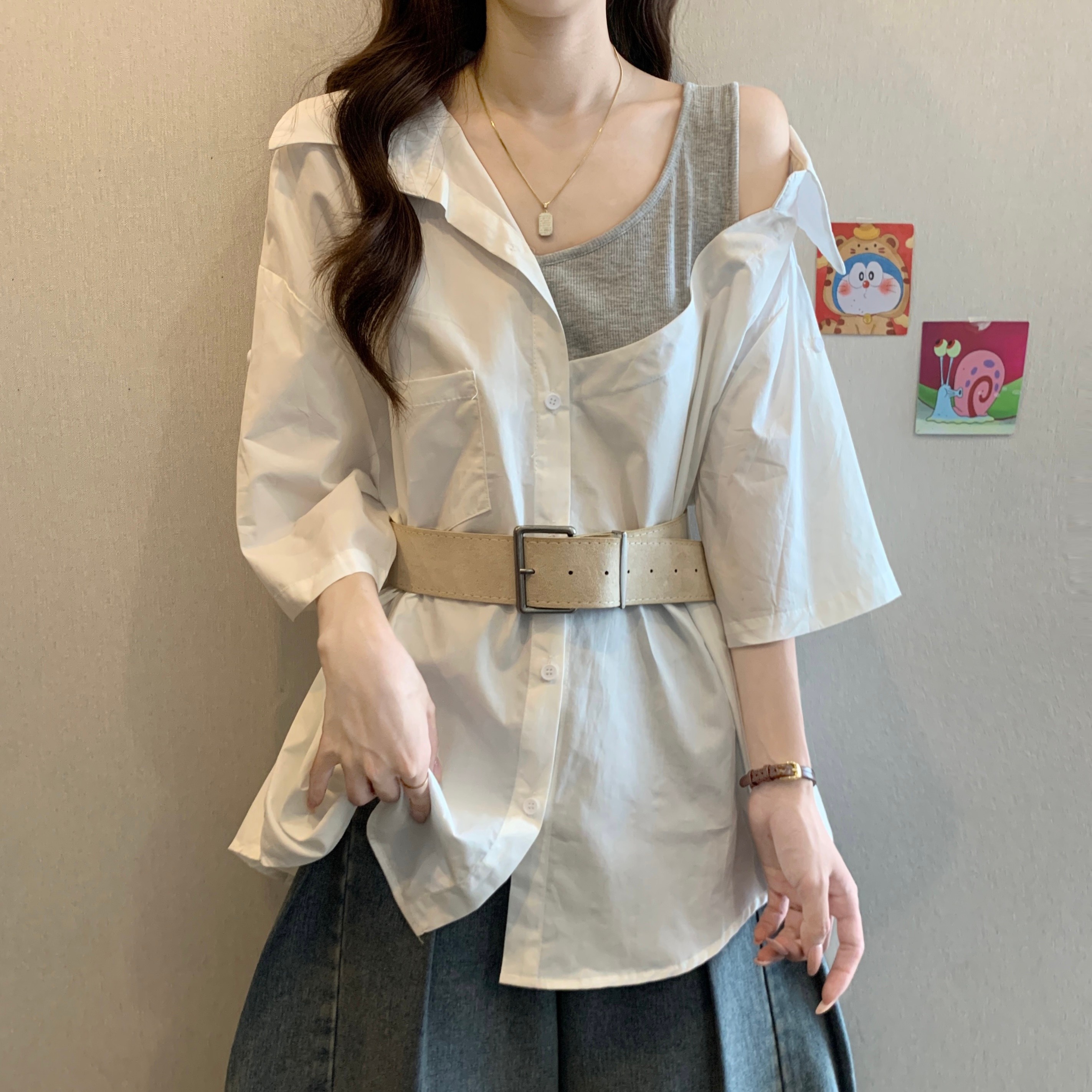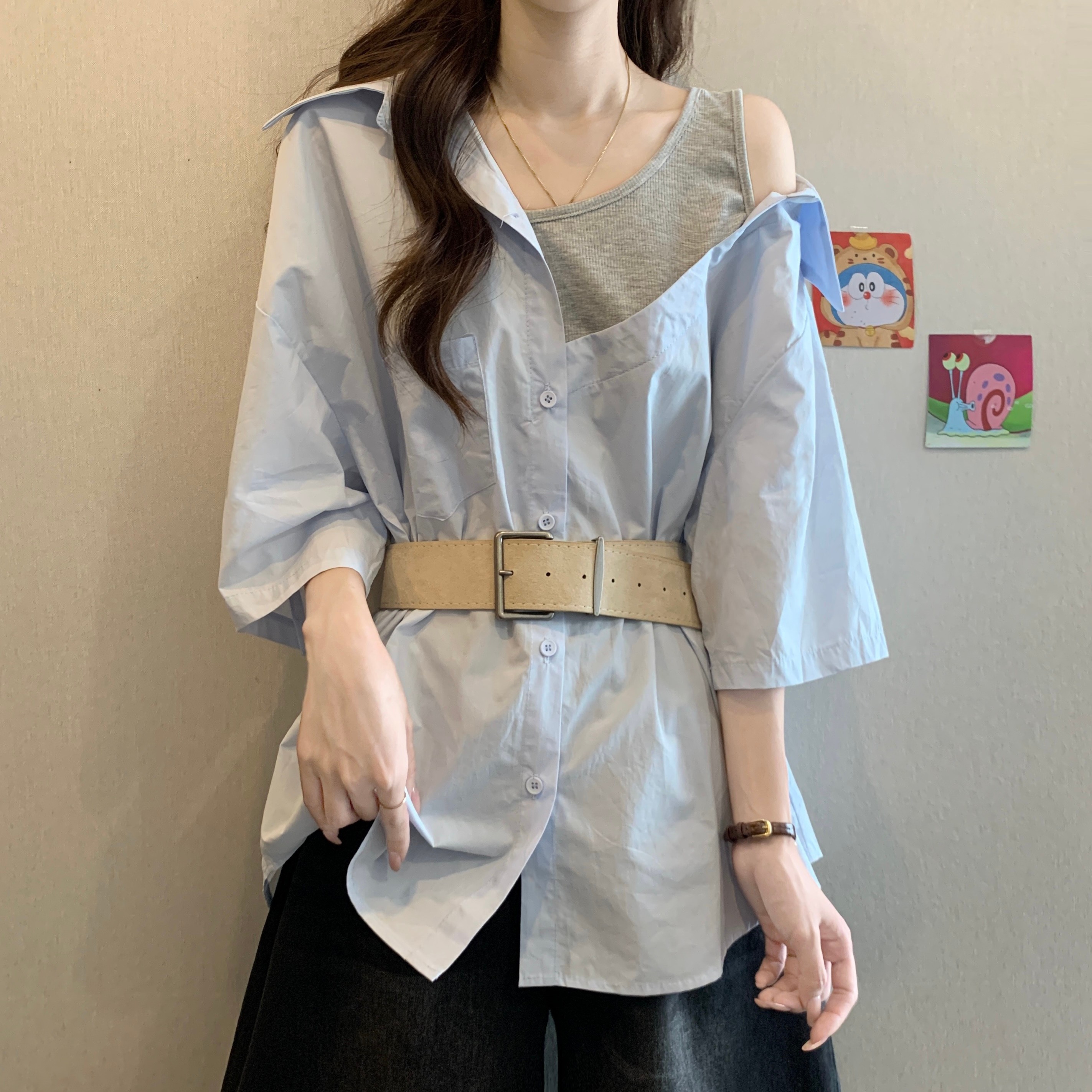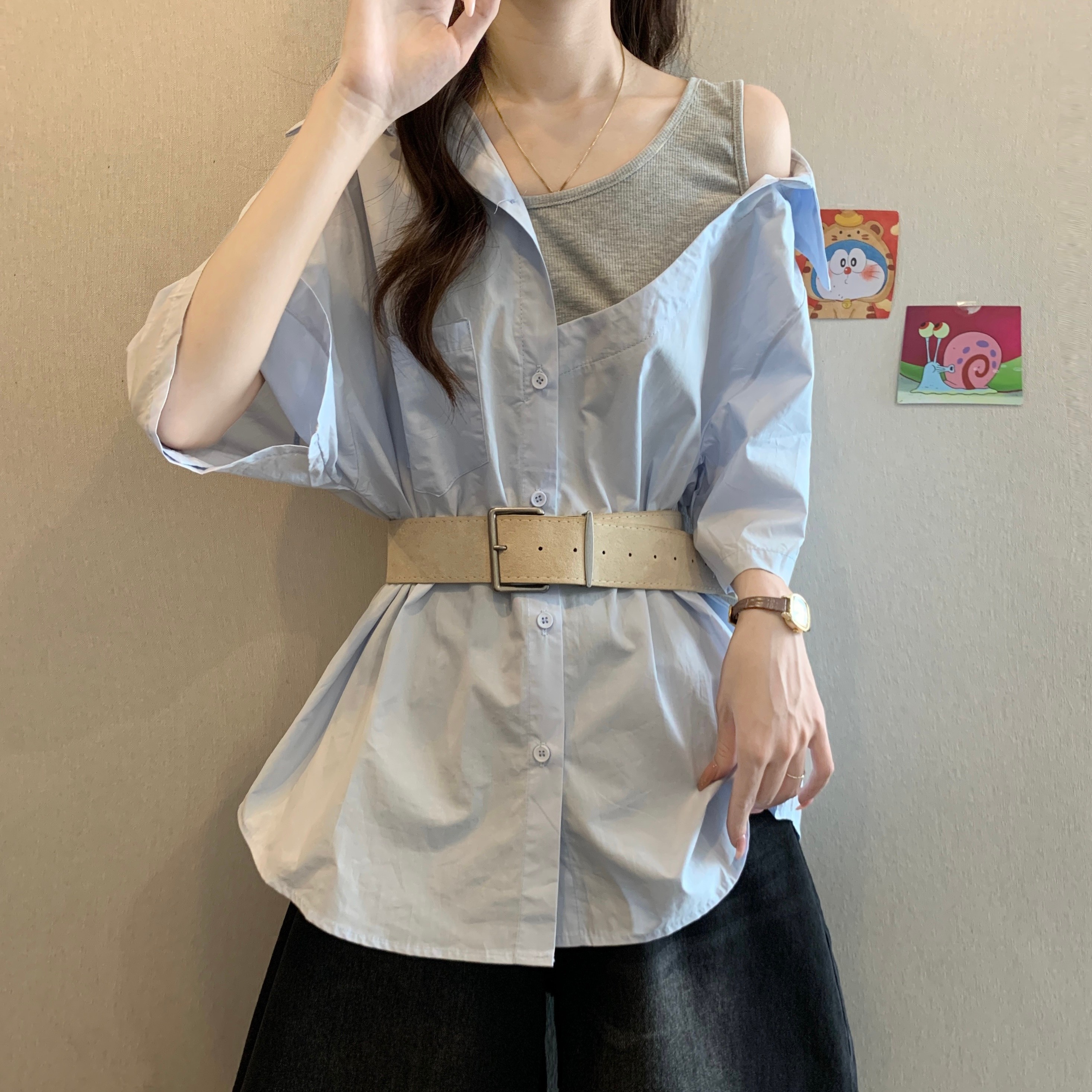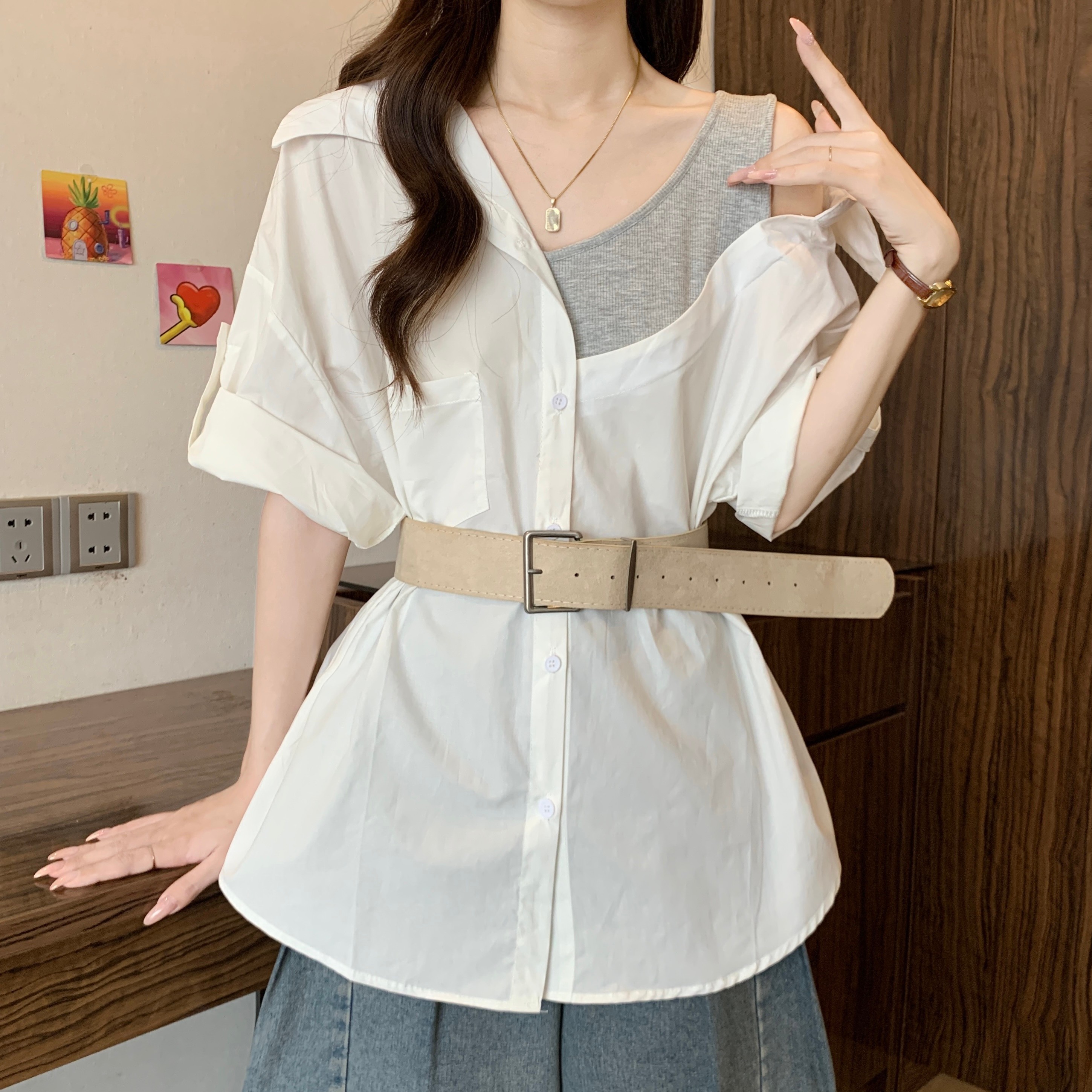 洋气减龄露肩假两件短袖衬衫女2025新款夏季大码胖mm收腰遮肚上衣