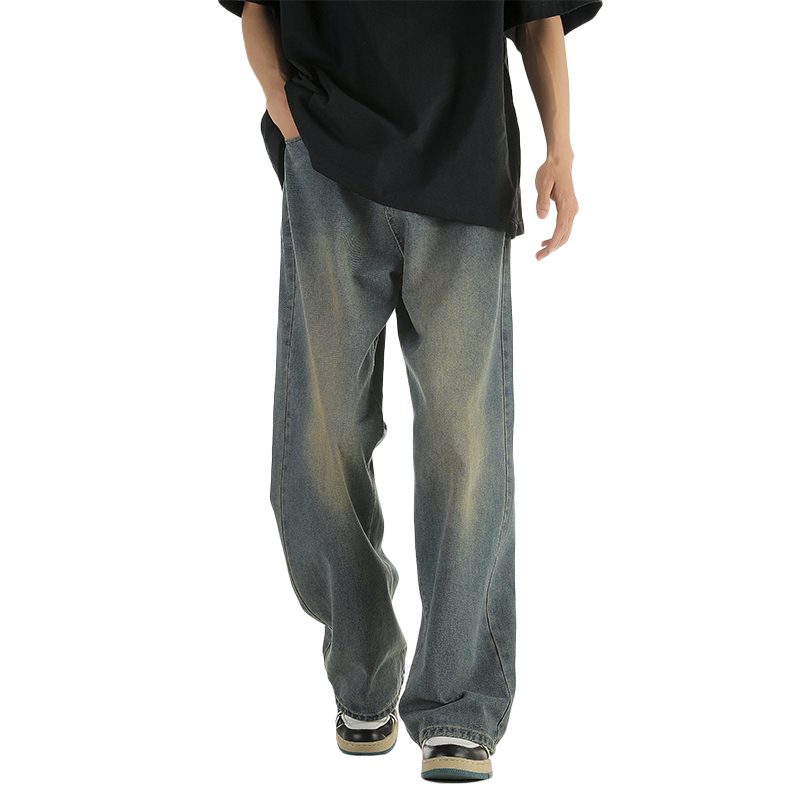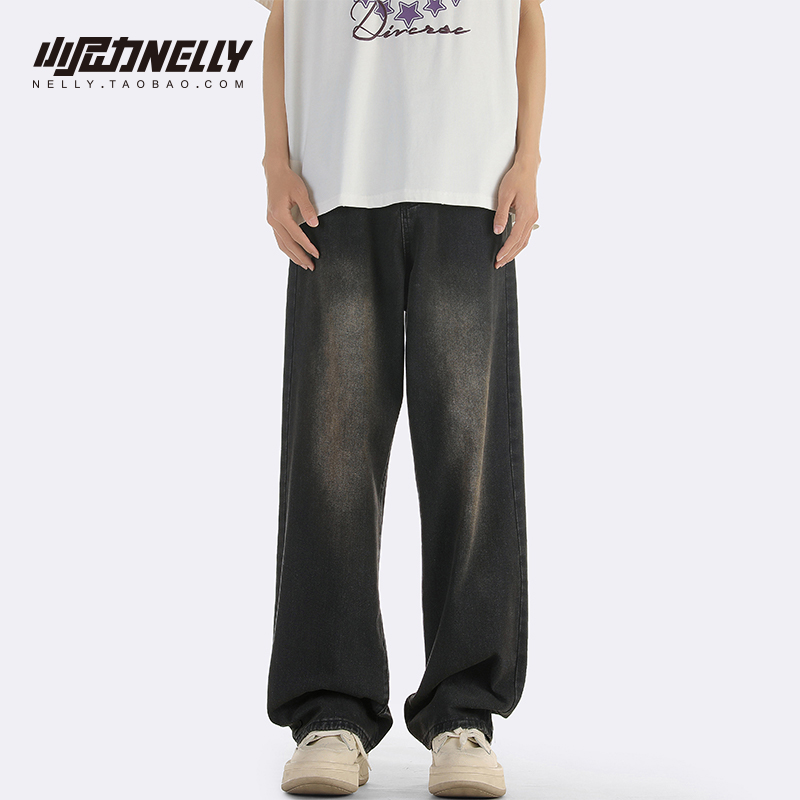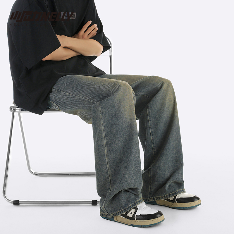潮流高街美式复古水洗做旧牛仔裤男女宽松直筒设计感hiphop长裤子