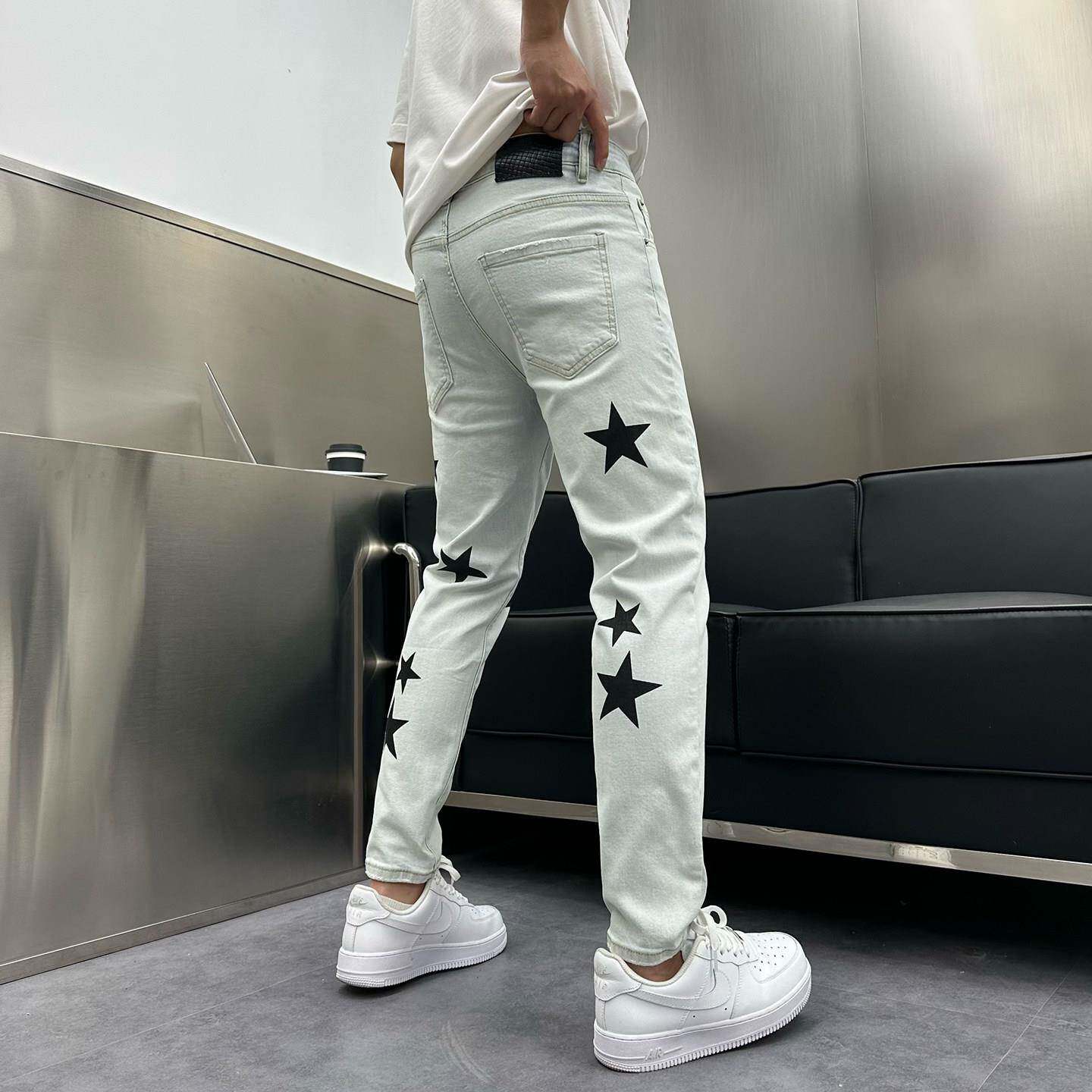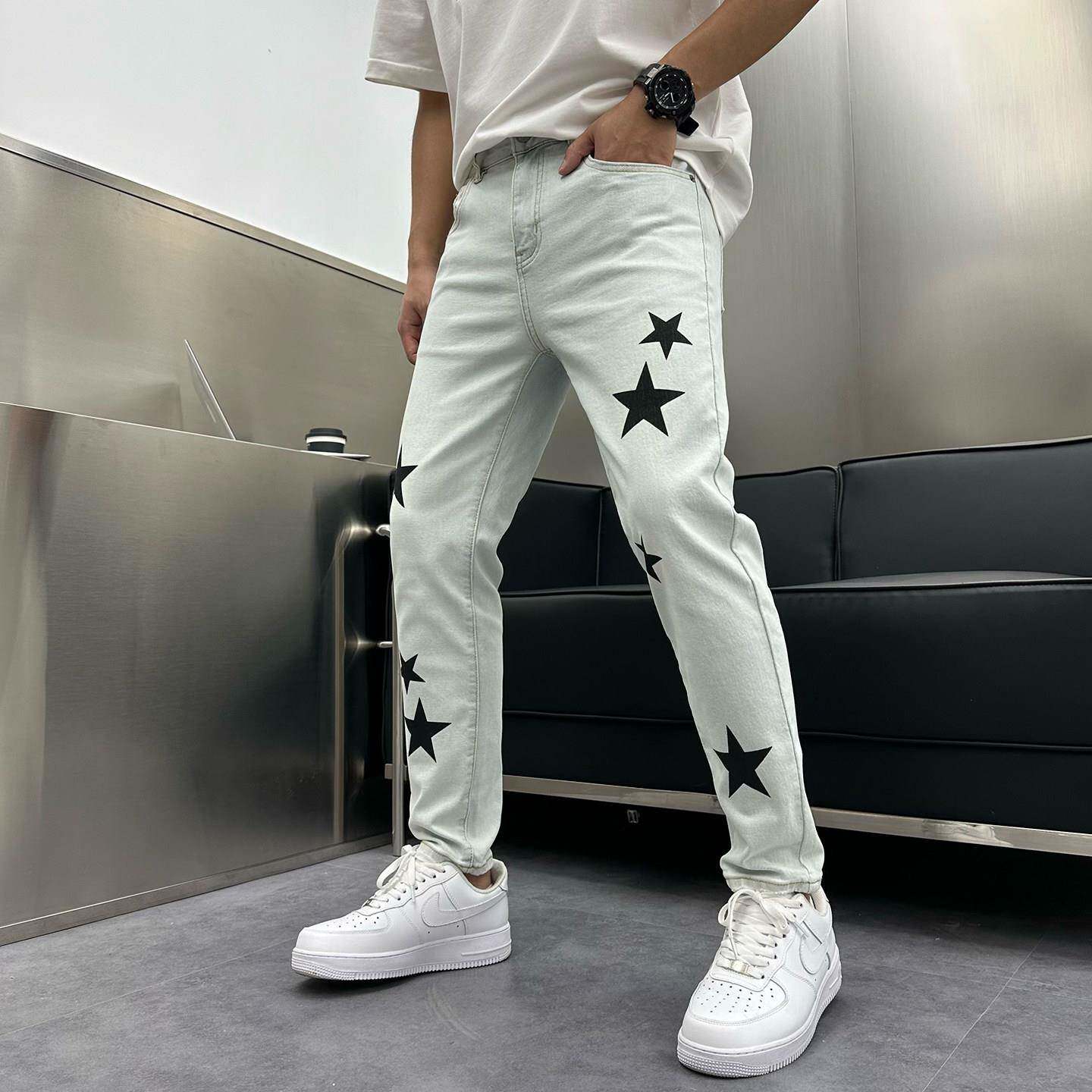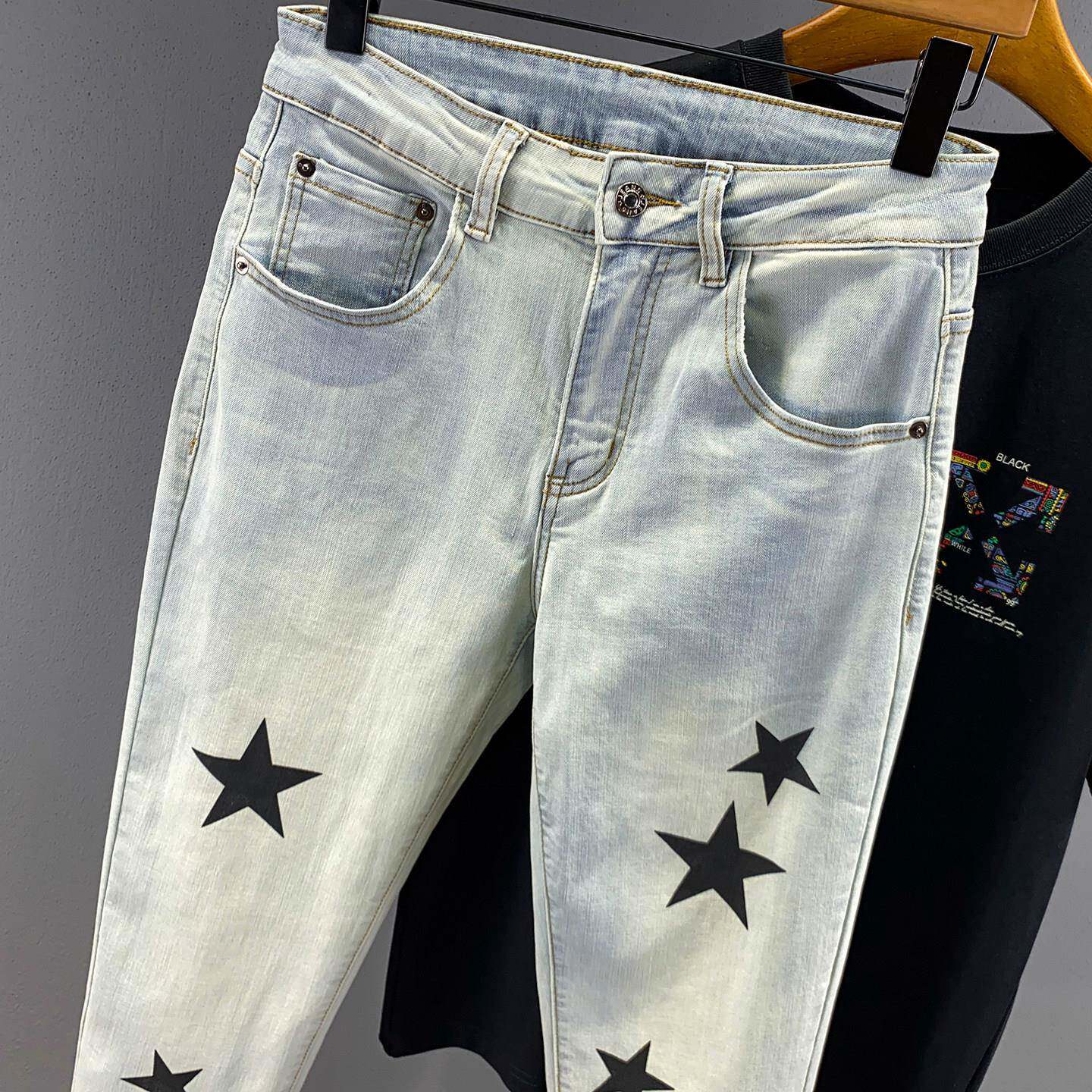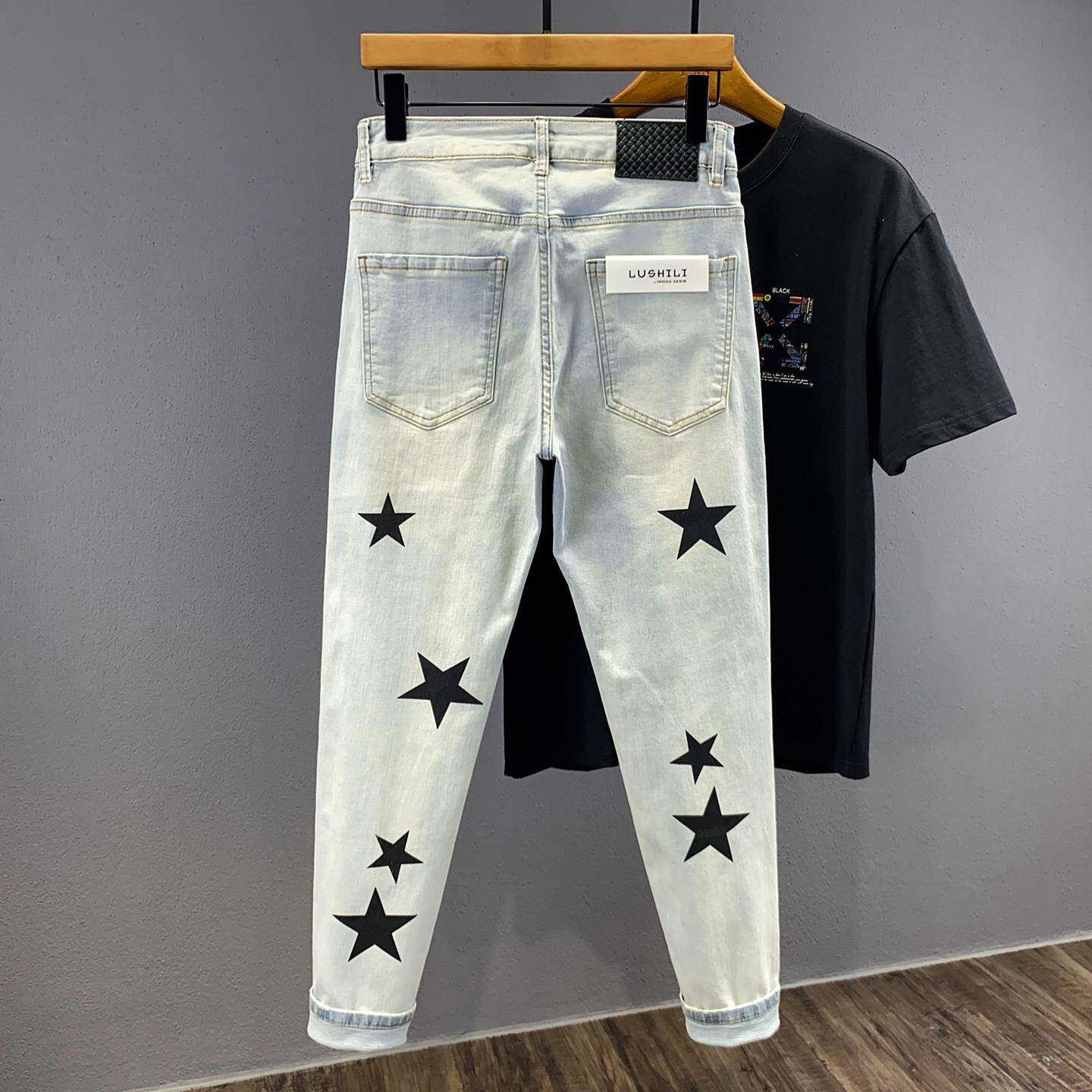 春夏夏季复古浅色九分牛仔裤男潮牌五星印花帅气修身小脚9分0226d