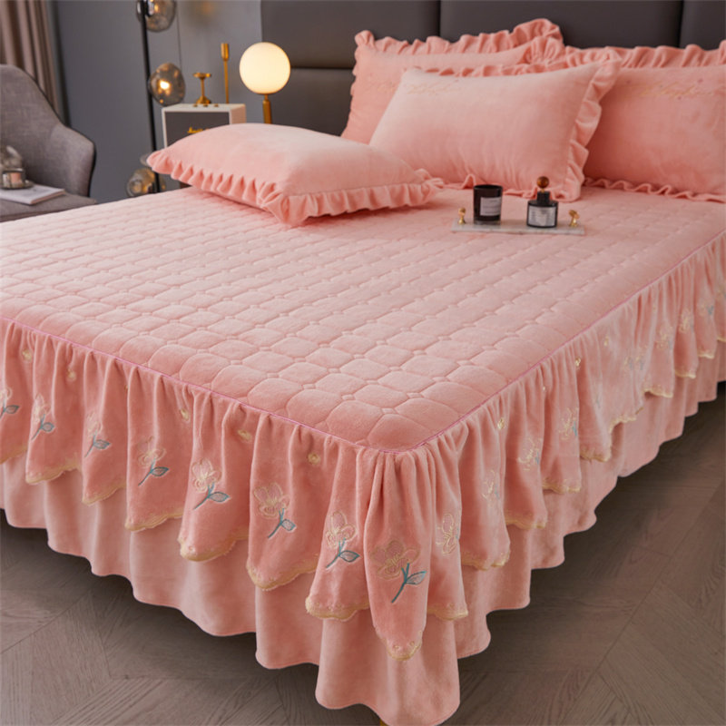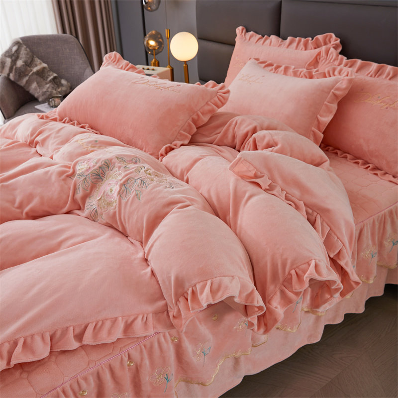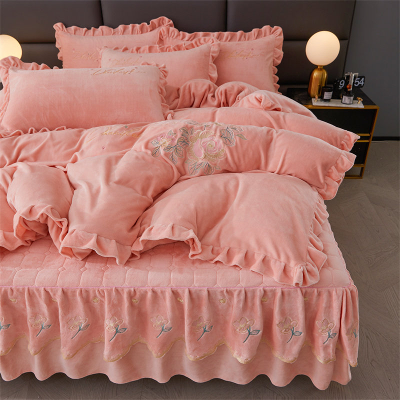 冬季加厚牛奶绒纯色刺绣夹棉床裙四件套保暖双面绒珊瑚绒被套床品