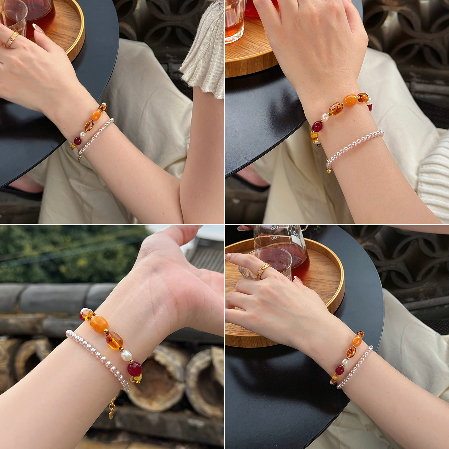 蜜蜂妈手作 天然蜜蜡琥珀红玛瑙淡水珍珠叠戴手链时尚精致手串