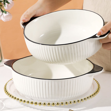 10英寸双耳竖纹大汤碗创意日式简约风格大汤盆大容量加厚陶瓷家用