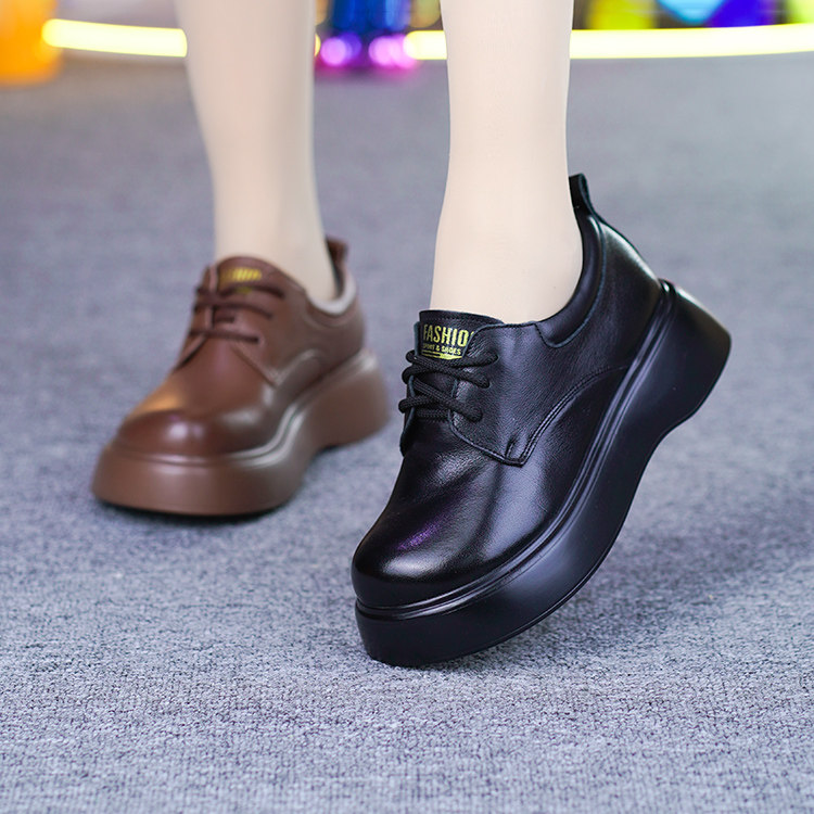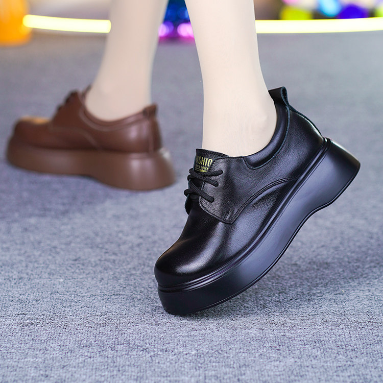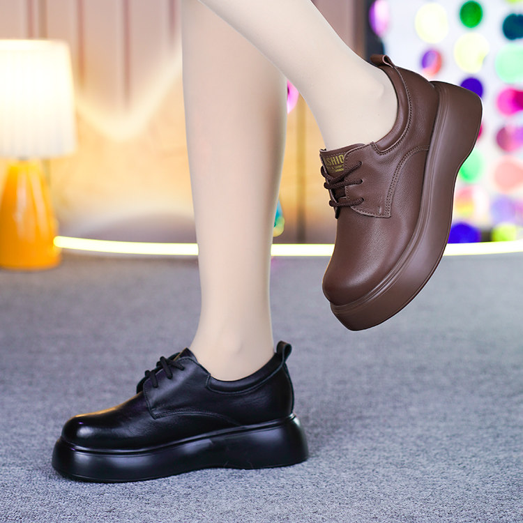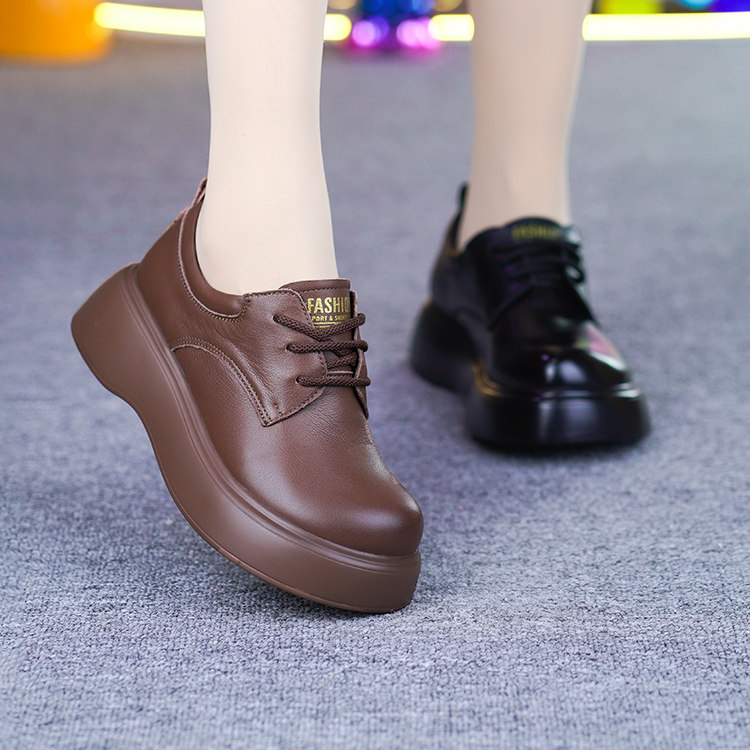 真皮厚底单鞋女秋季新款超轻松糕底纯牛皮圆头系带坡跟妈妈皮鞋