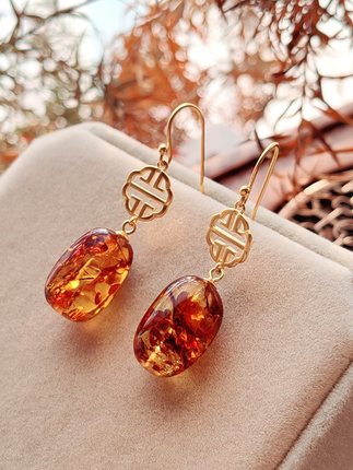 天然琥珀花珀耳环随型珠宝耳坠复古国潮气质优雅S925纯银镀金耳饰