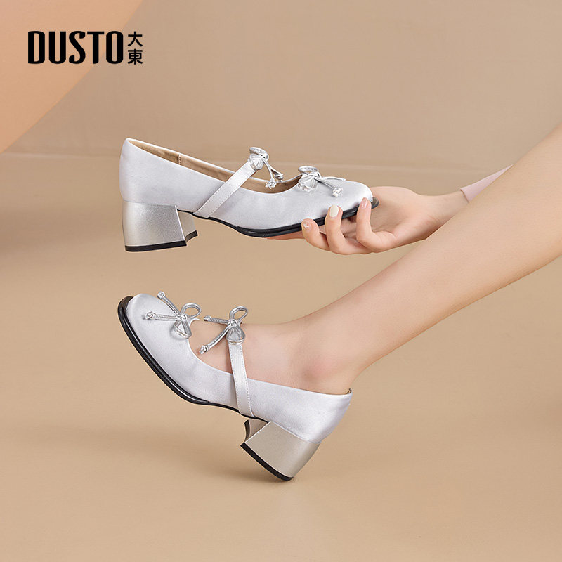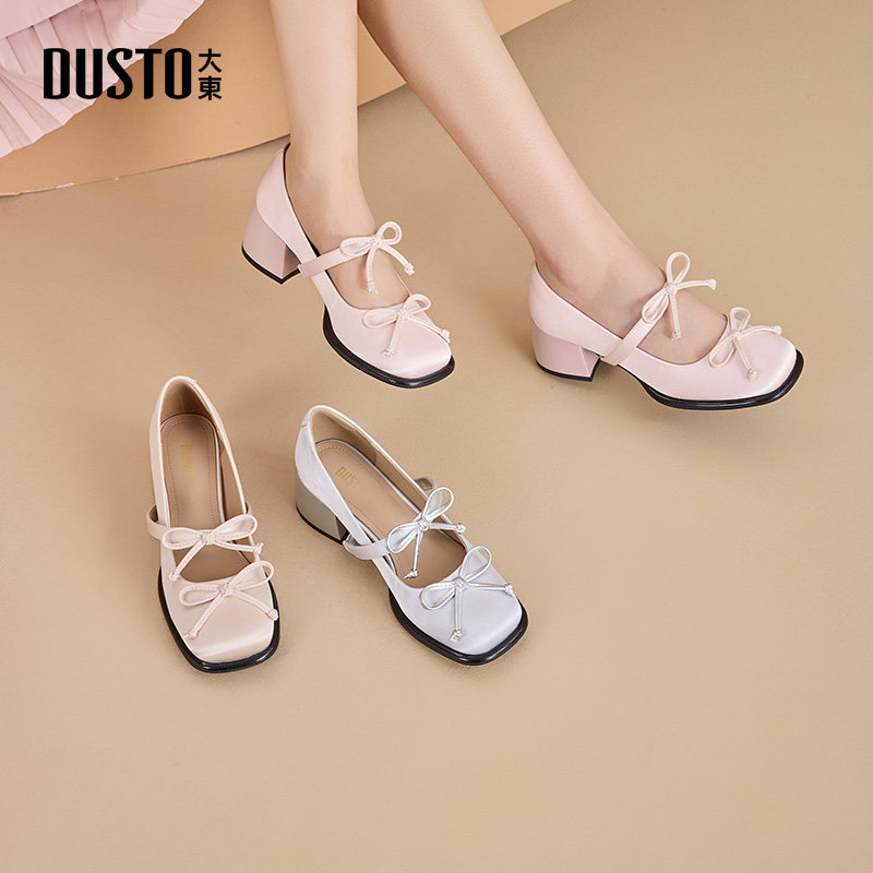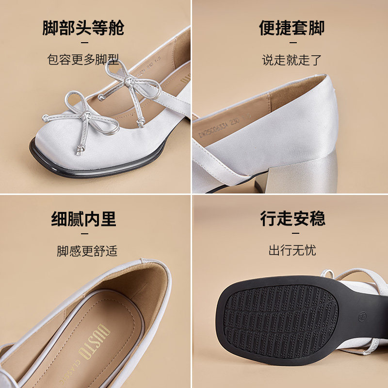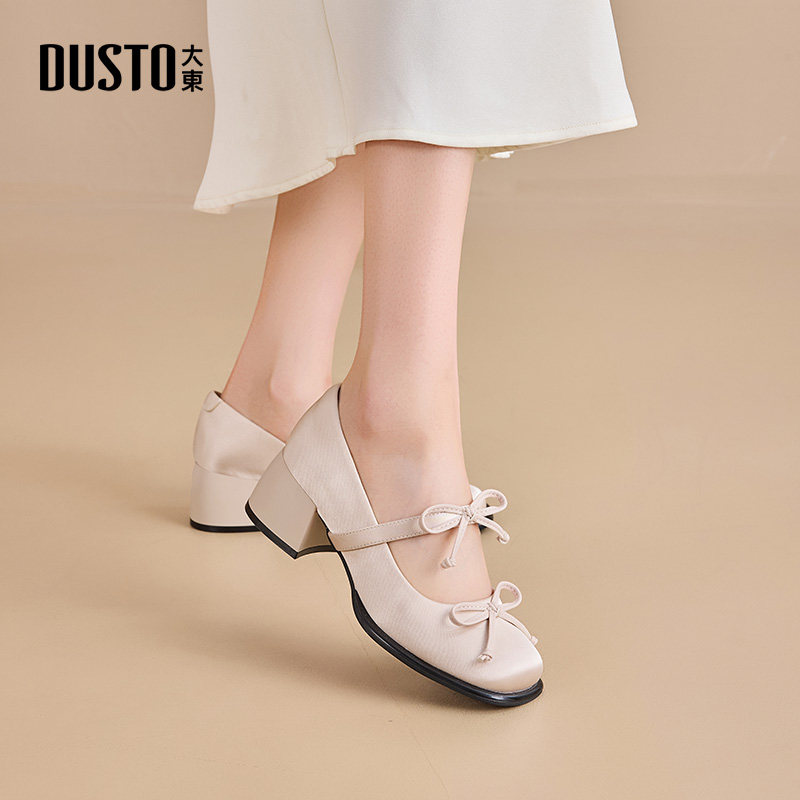 大东女鞋玛丽珍鞋2026春季新款时尚甜美粗跟中跟蝴蝶结方头女单鞋
