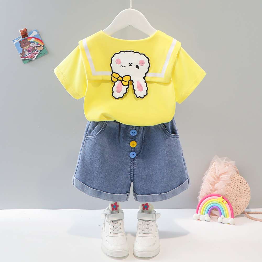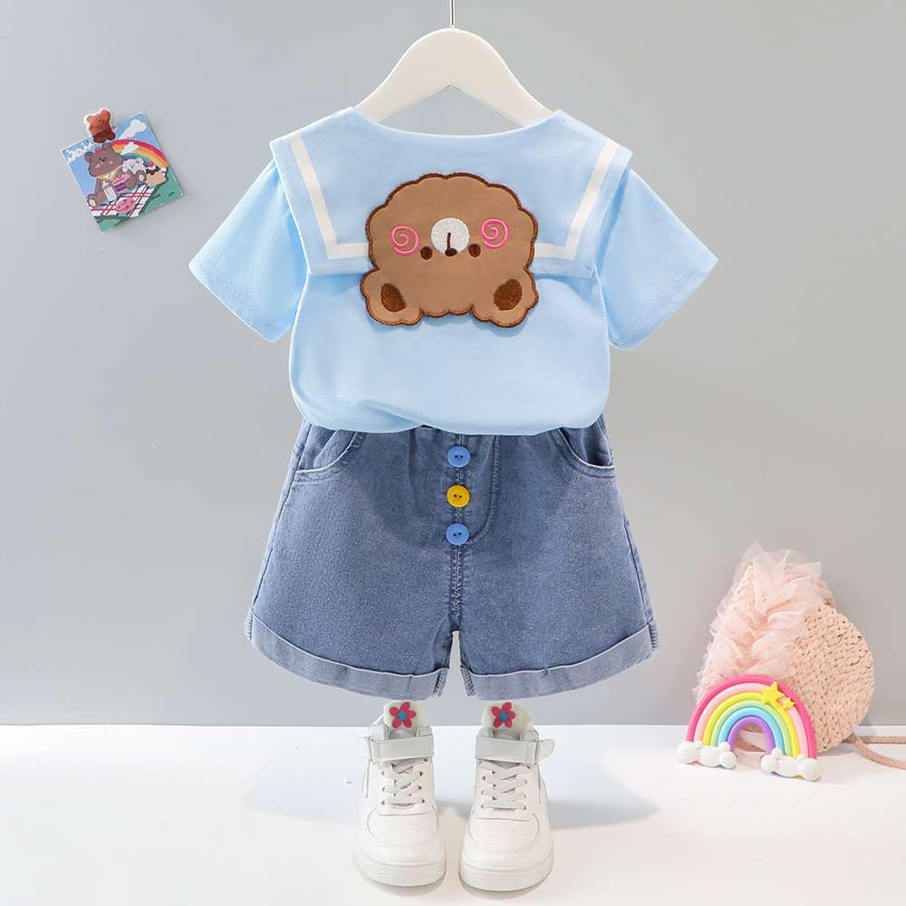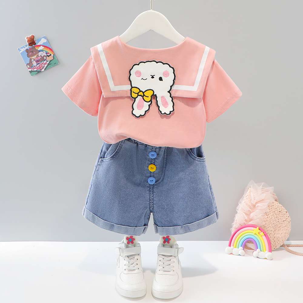 女童洋气翻领动物夏季套装女宝宝可爱夏装韩版短袖两件套时髦潮