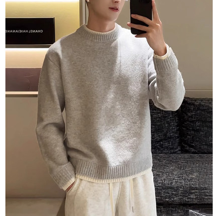 美利奴绵羊毛混纺假两件圆领毛衣男士羊毛衫秋冬新款内搭针织衫男