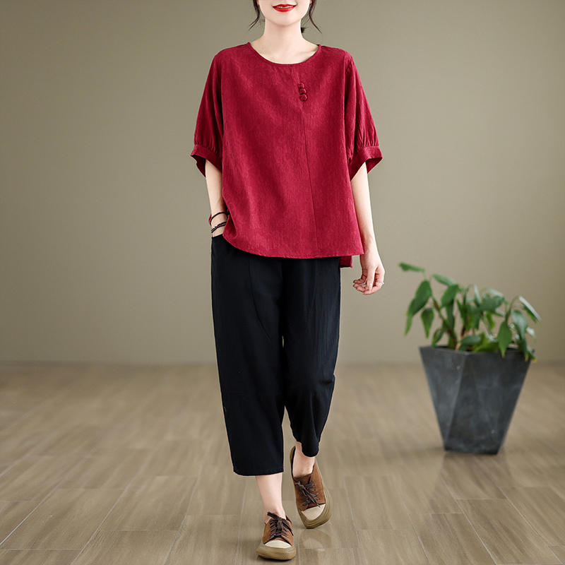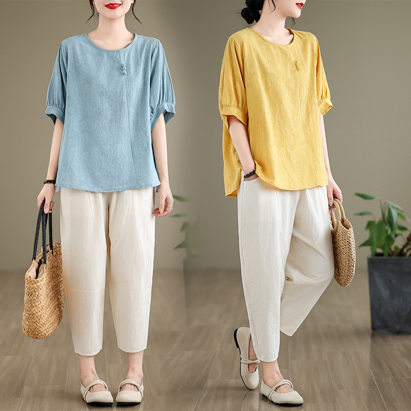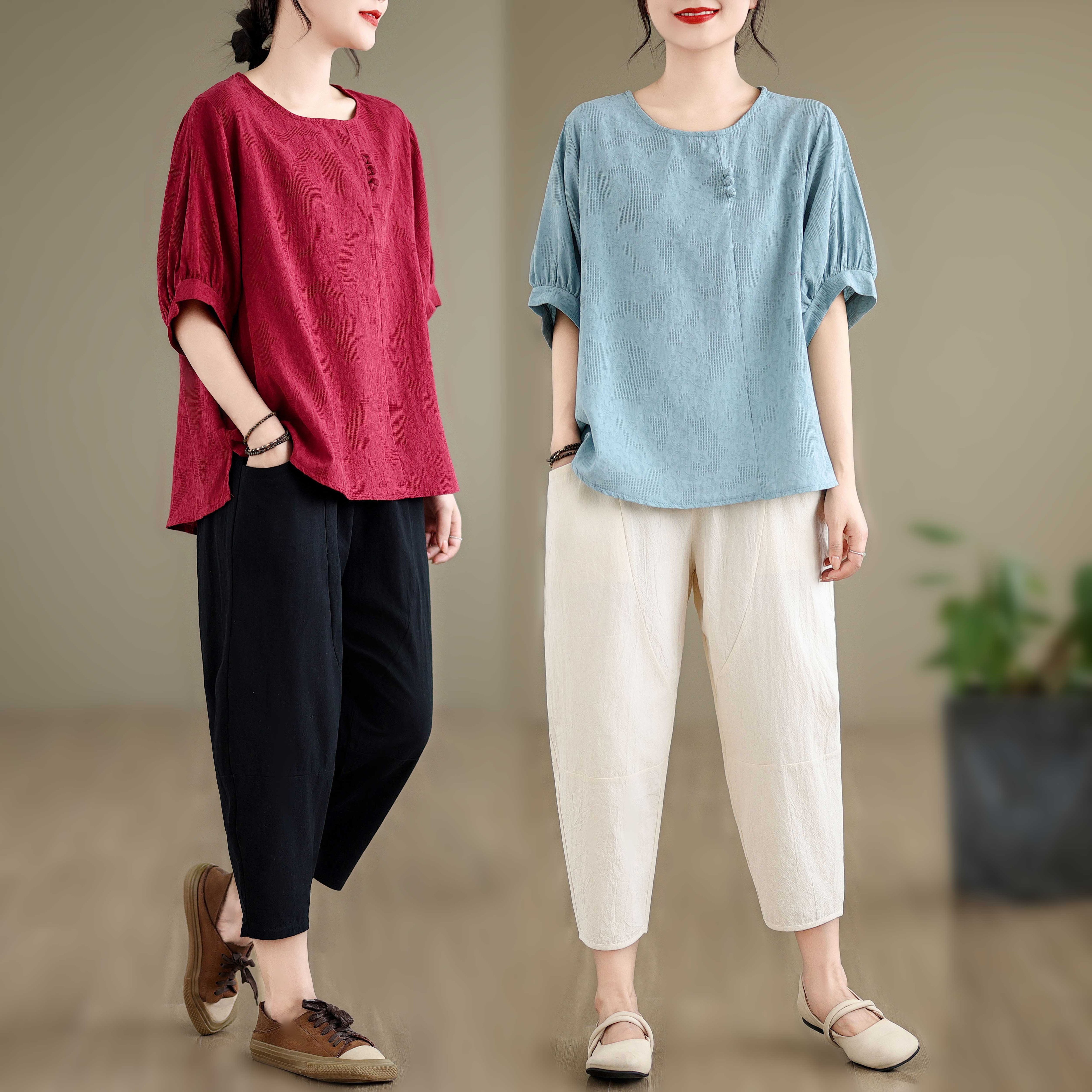2025夏季小个子宽松显瘦棉麻中式提花上衣休闲哈伦裤套装女