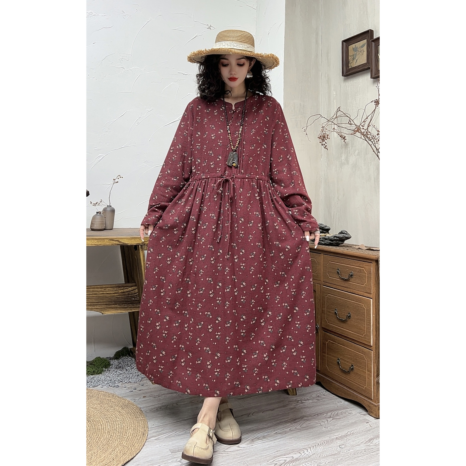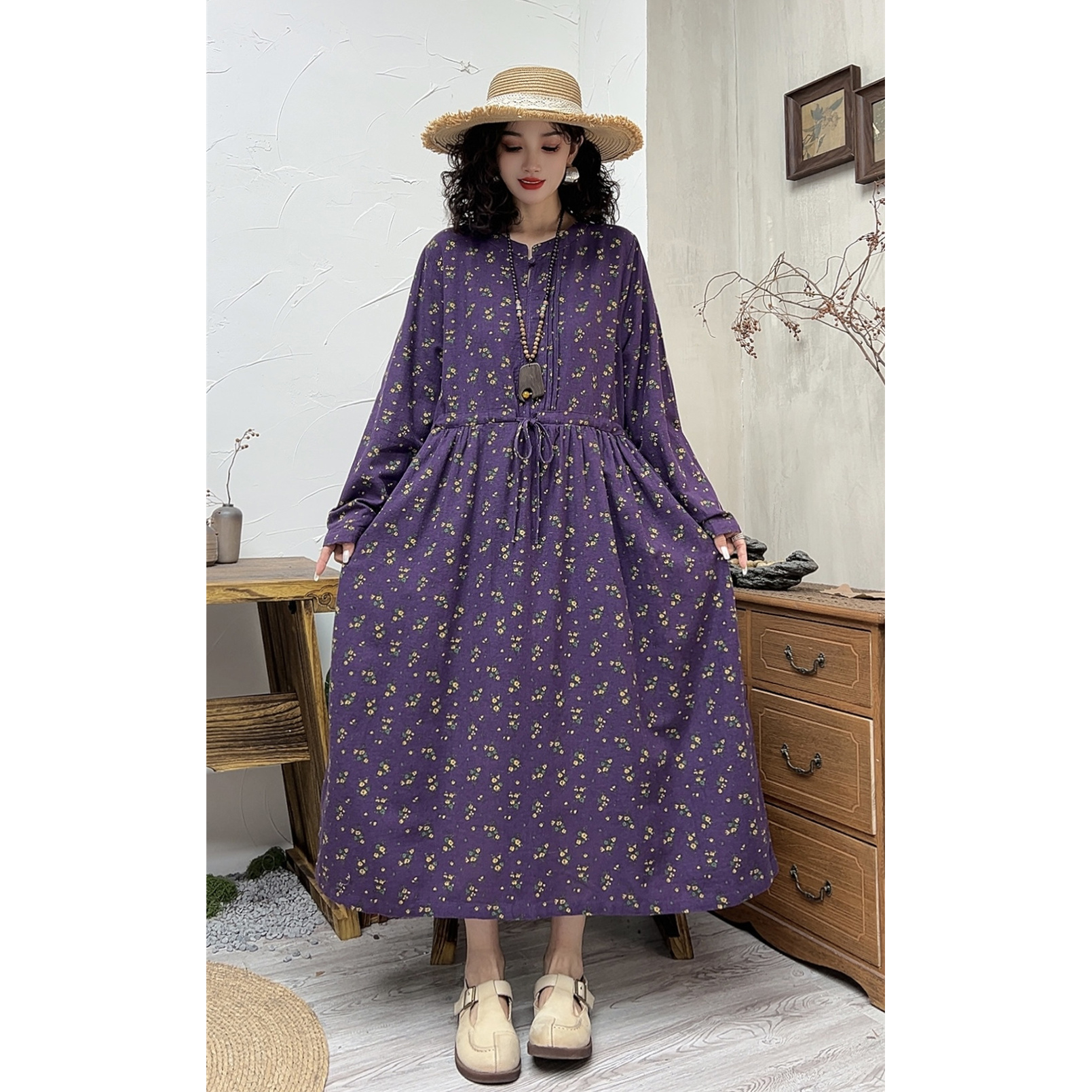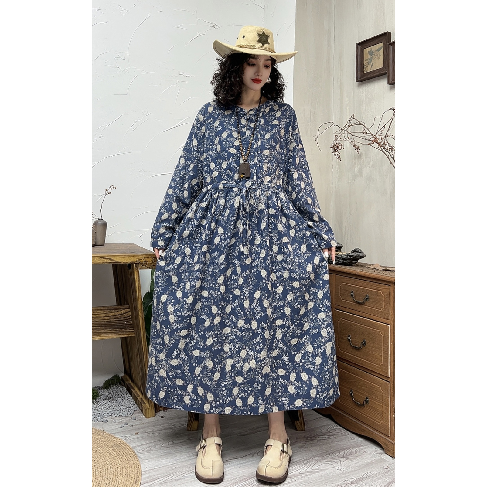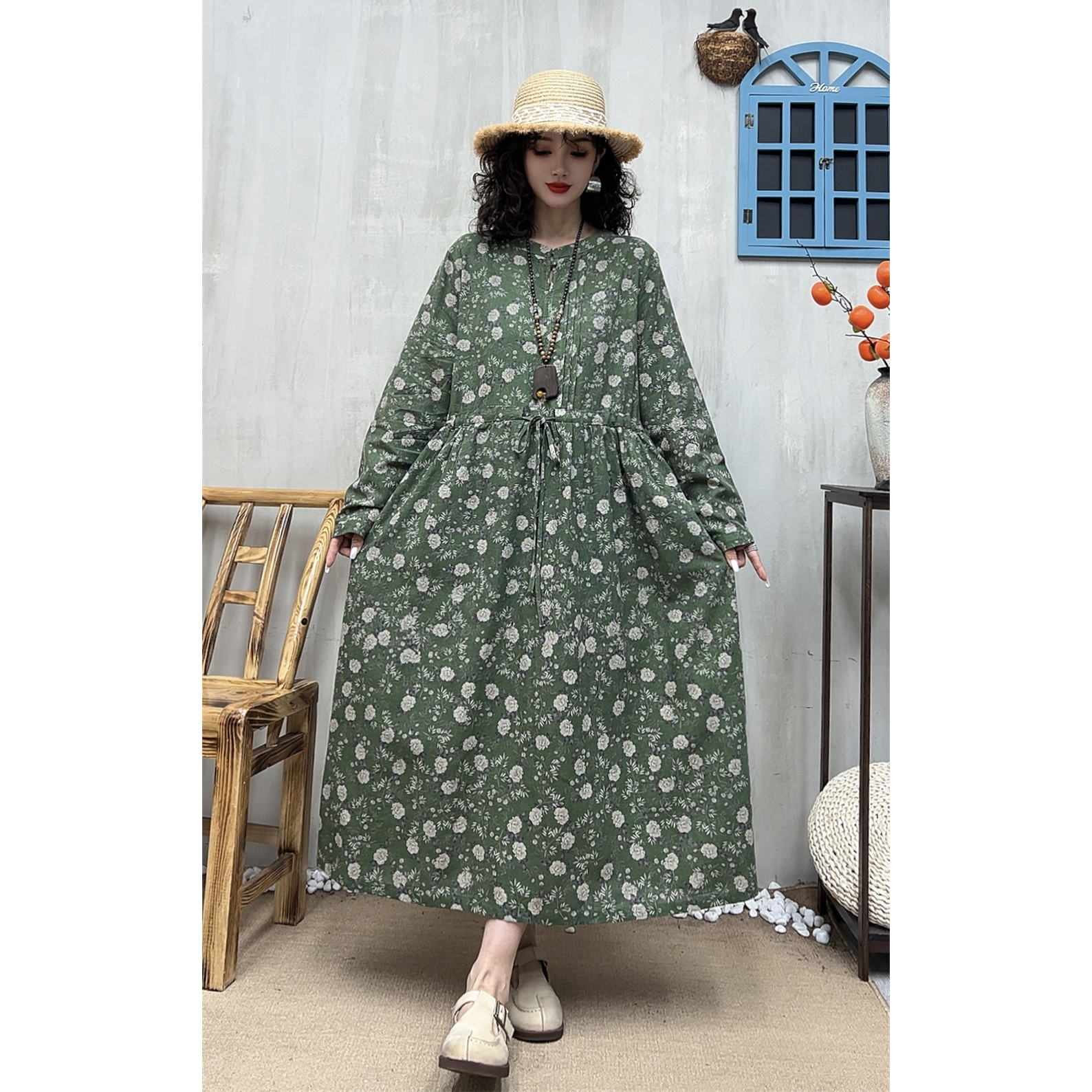 秋季新复古棉麻印花长袖系带连衣裙女宽松显瘦百搭立领A字长裙女