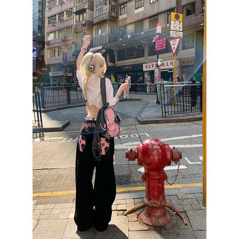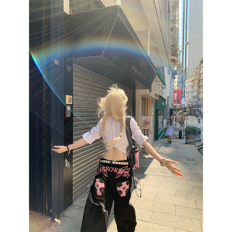 JMJ 美式设计感水洗字母刺绣铆钉阔腿牛仔裤男女高街休闲直筒长裤