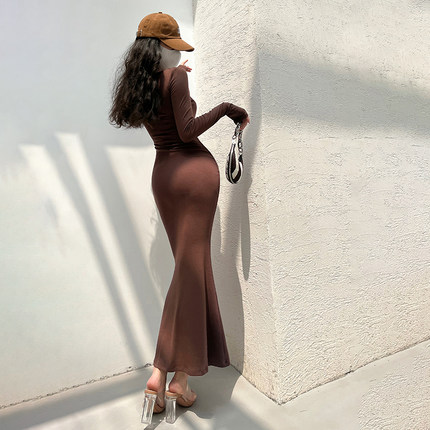 绝美鱼尾连衣裙女春小个子修身收腰紧身纯欲御姐小妈后妈包臀长裙