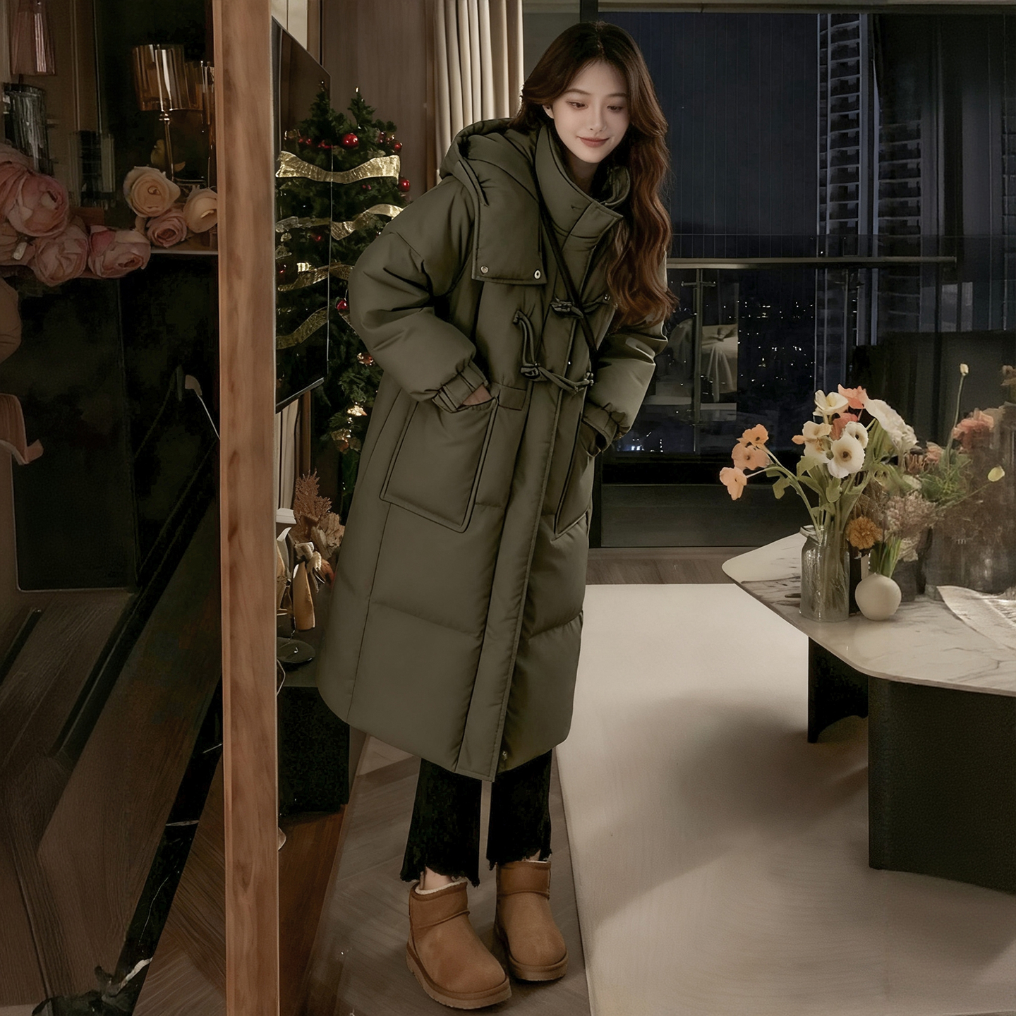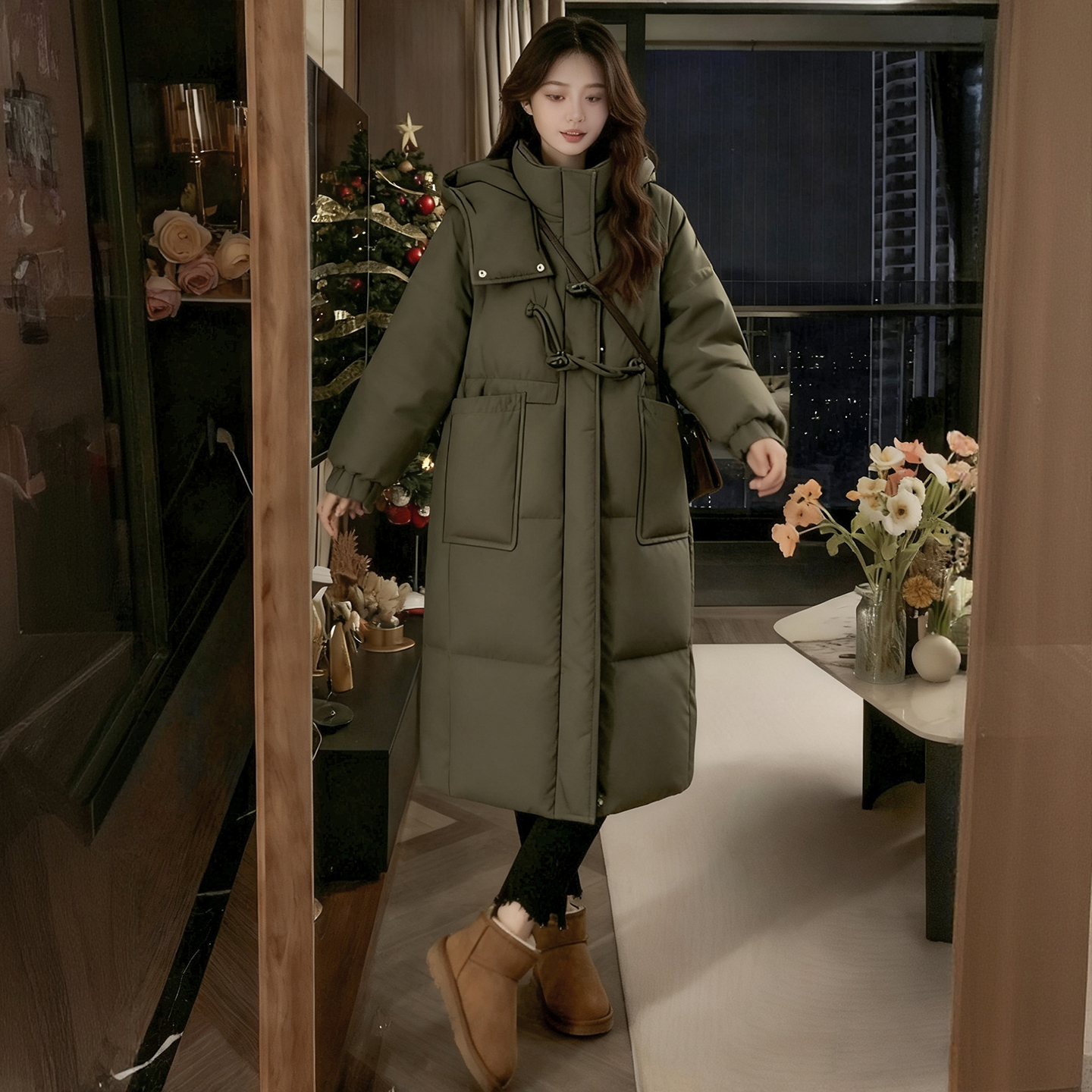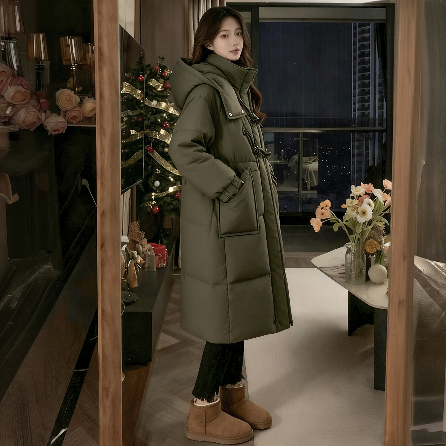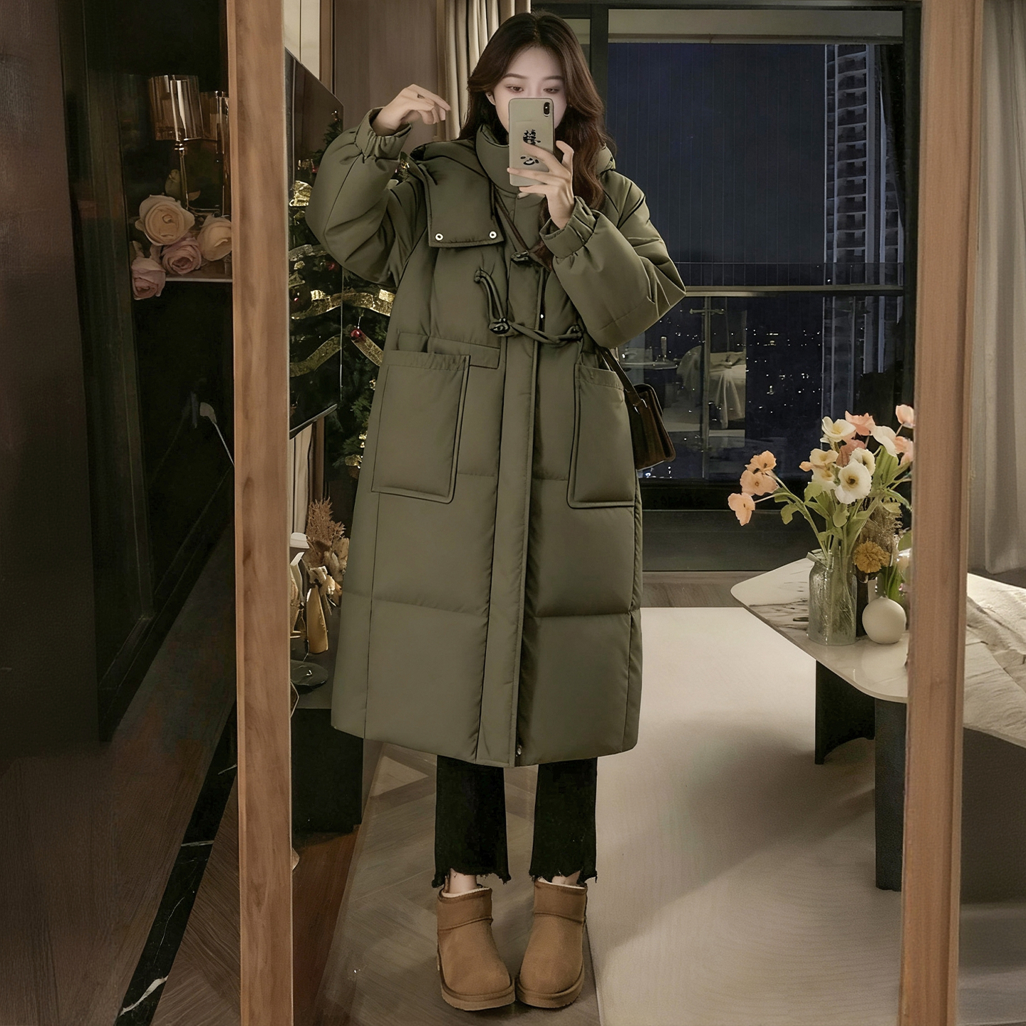 胖mm大码女装宽松加厚保暖连帽棉服女冬季灰绿色高级感中长款棉衣