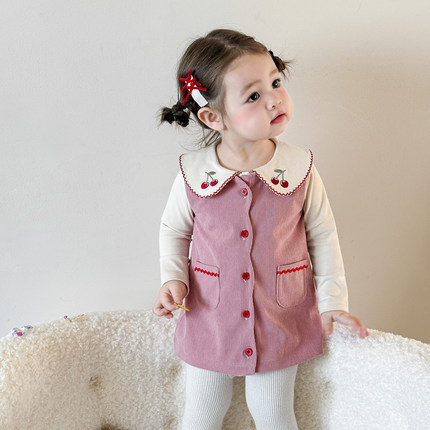 2025秋季新品女宝宝休闲开扣背心裙婴幼儿刺绣花边领打底两件套