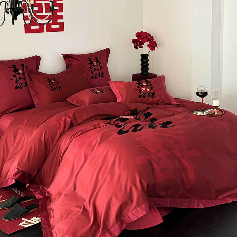 飒!中国a风婚庆四六七件套全棉结婚新婚刺绣贡缎轻奢床上用品