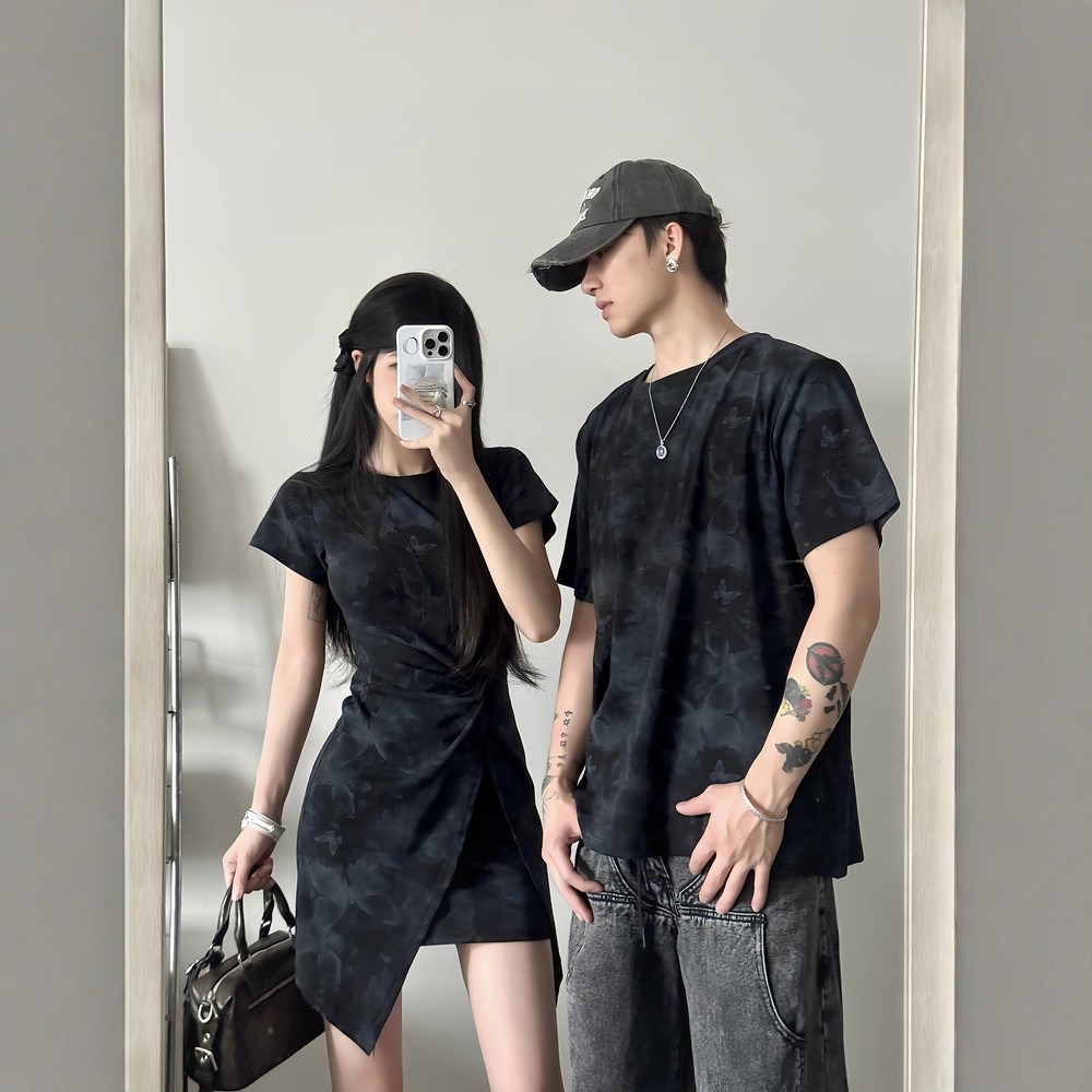 情侣装一裙一衣2025新款夏季设计感法式别致连衣裙复古风时尚短袖