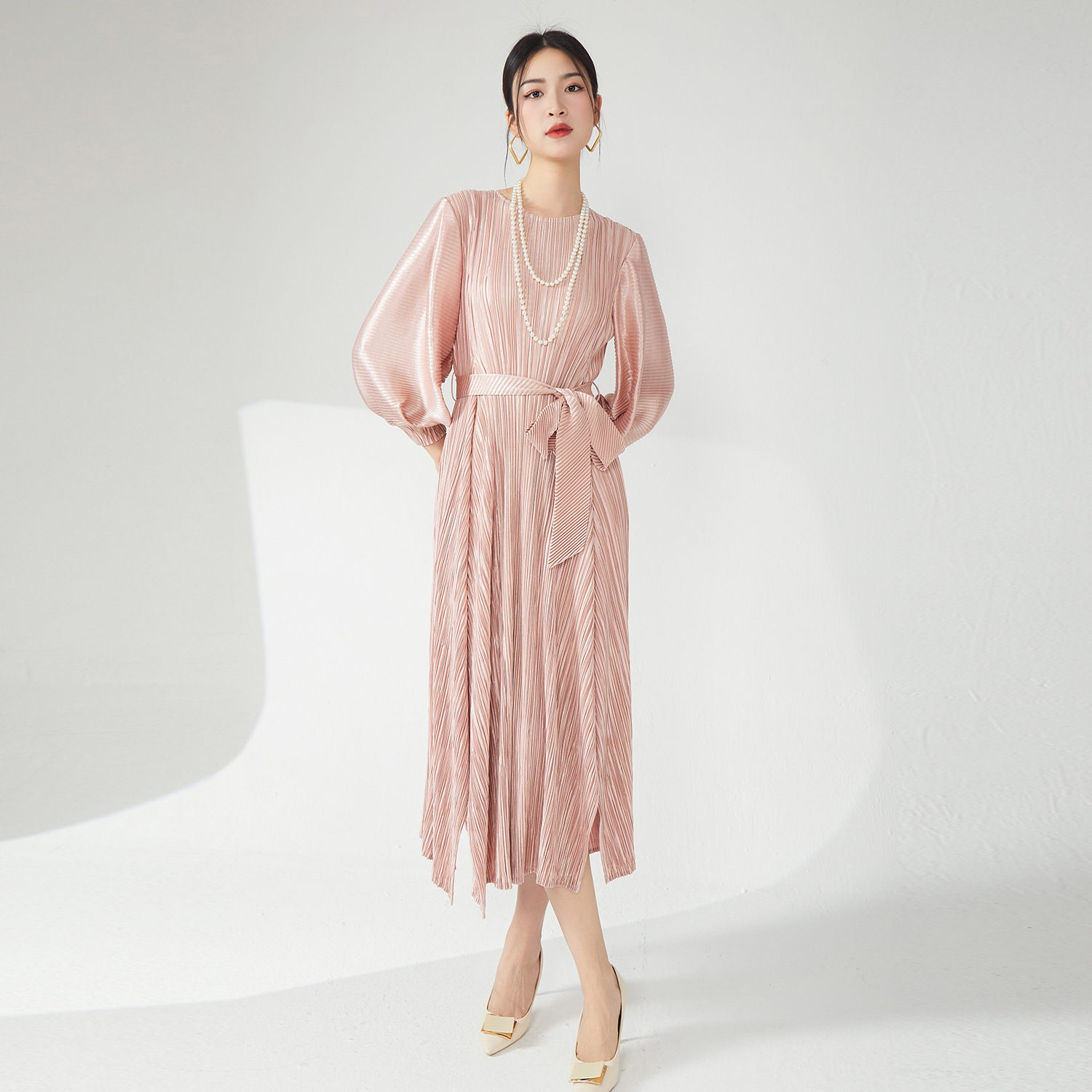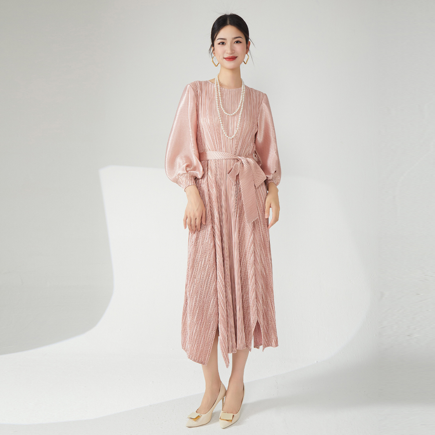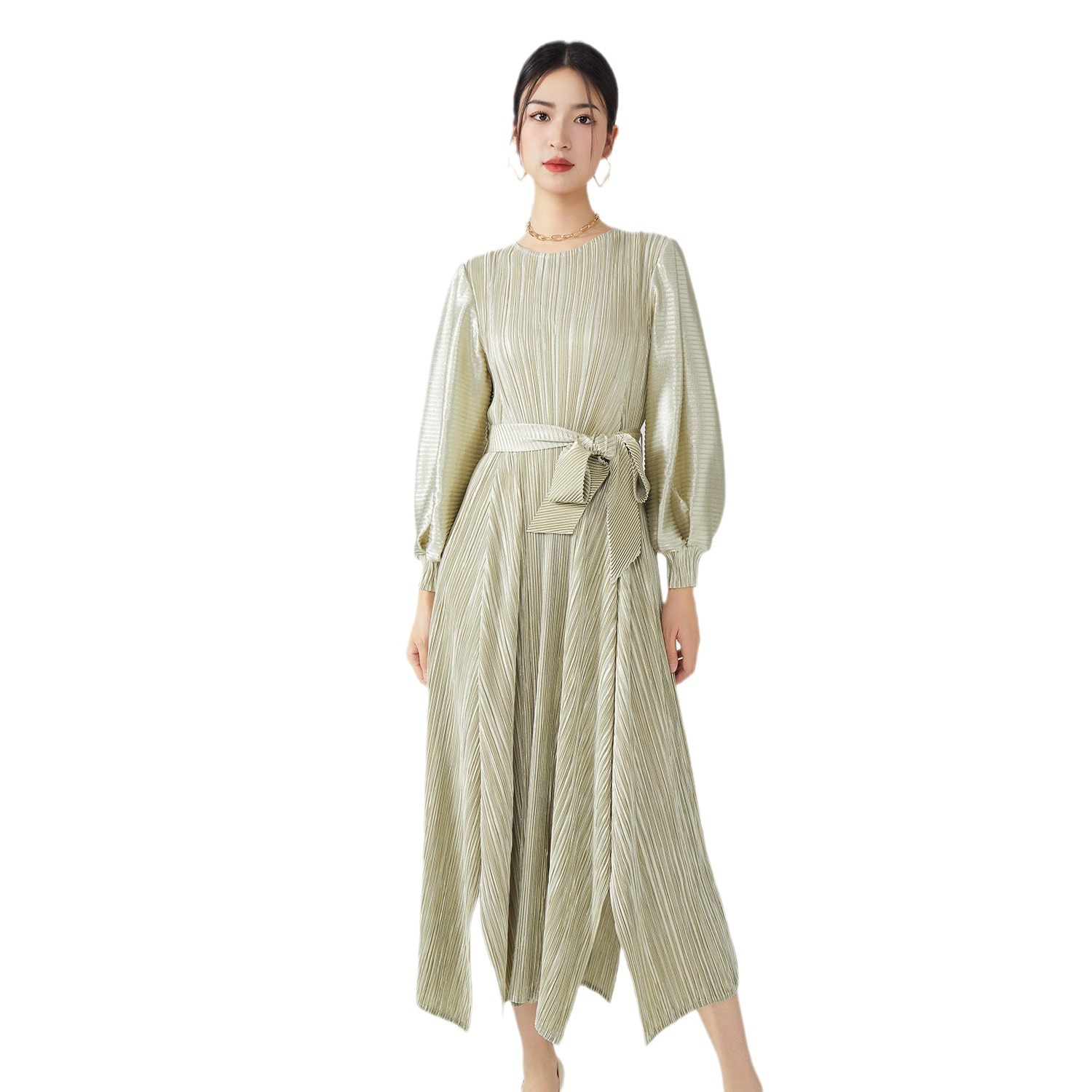 连衣裙大码女装五金灯笼袖宽松系带气质优雅褶皱裙春秋季长裙纯色