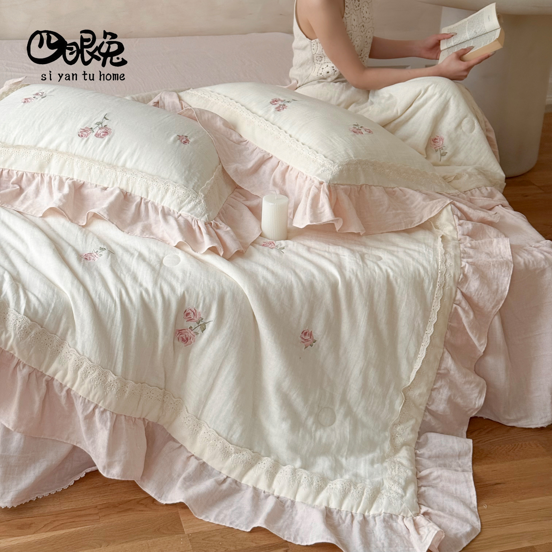 浅雾晨曦︱法式全棉皱皱双层纱夏凉被四件套刺绣空调被柔软薄被子