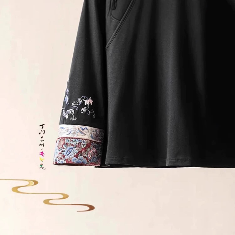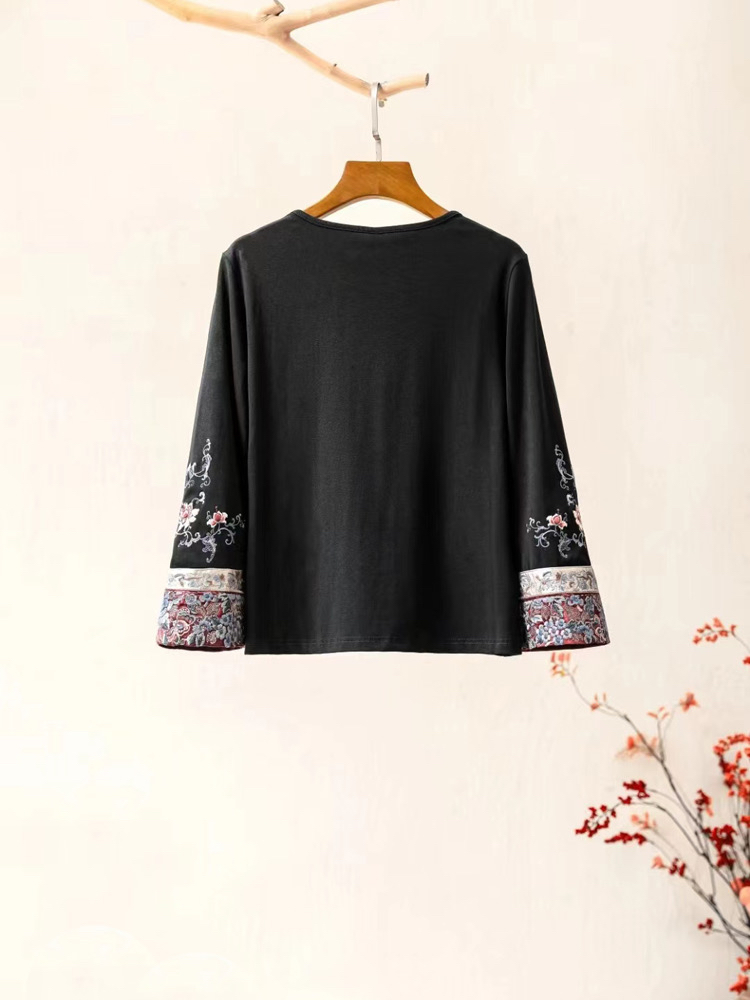 楚馨秋冬新款复古文艺新中式国风女装圆领刺绣黑色百搭打底衫